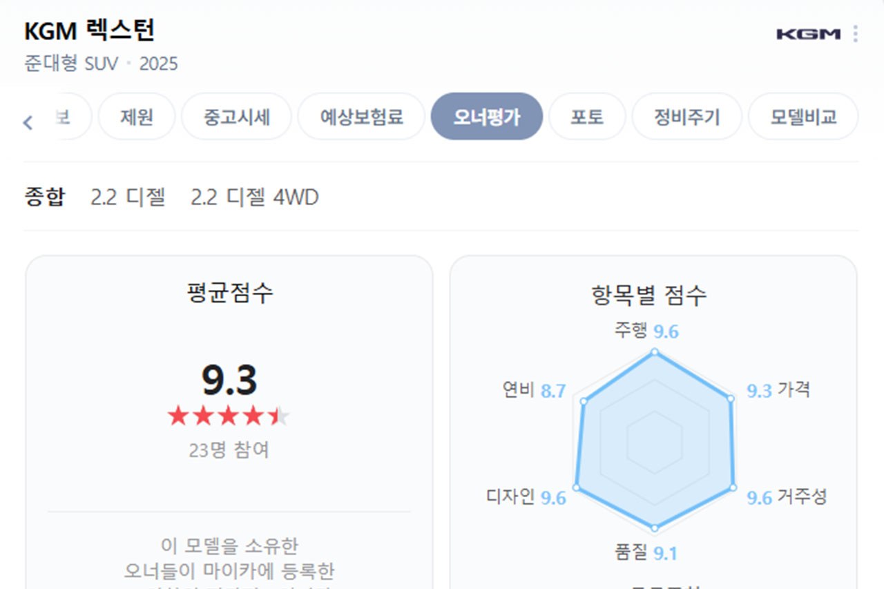 실제 차주들의 평가를 기반으로 차량 만족도 점수를 공개하는 ‘네이버 마이카 오너평가’에 따르면 KG모빌리티 렉스턴의 평균 점수는 9.3점을 기록했다.