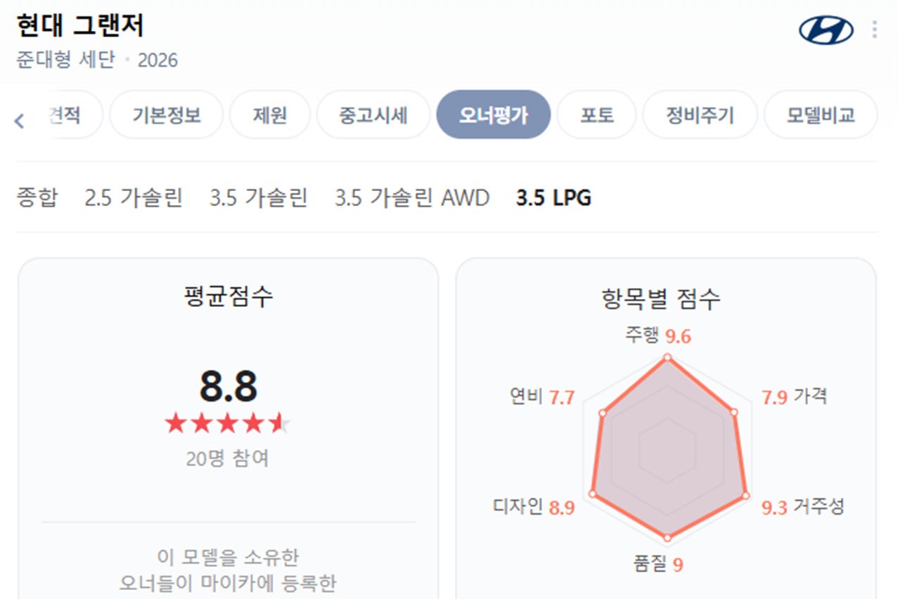 실제 차주들의 평가를 기반으로 차량 만족도 검사를 공개하는 ‘네이버 마이카 오너평가’에 다르면 현대차 그랜저 3.5 LPG의 오너평가 평균 점수는 8.8점이다.
