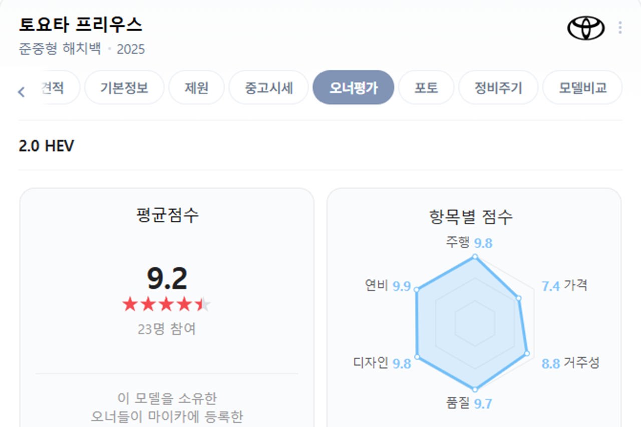 실제 차주들의 평가를 기반으로 차량 만족도 점수를 공개하는 ‘네이버 마이카 오너평가’에 따르면 토요타 프리우스의 오너평가 평균 점수는 9.2점이다.