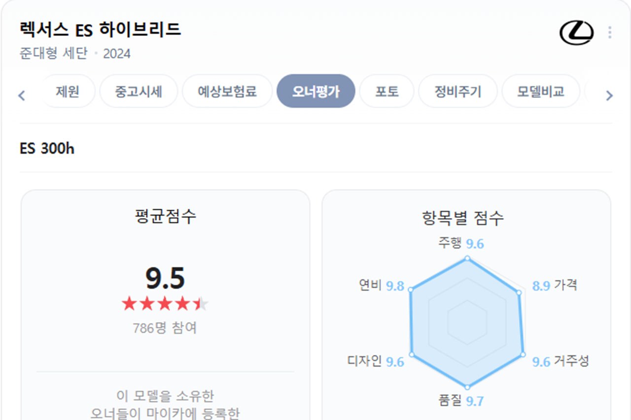 실제 차주들의 평가를 기반으로 차량 만족도 점수를 공개하는 ‘네이버 마이카 오너평가’에 따르면 렉서스 ES 300h의 오너평가 점수는 9.5점이다. 가격을 제외한 모든 항목이 9점 이상의 높은 평가를 받았다.