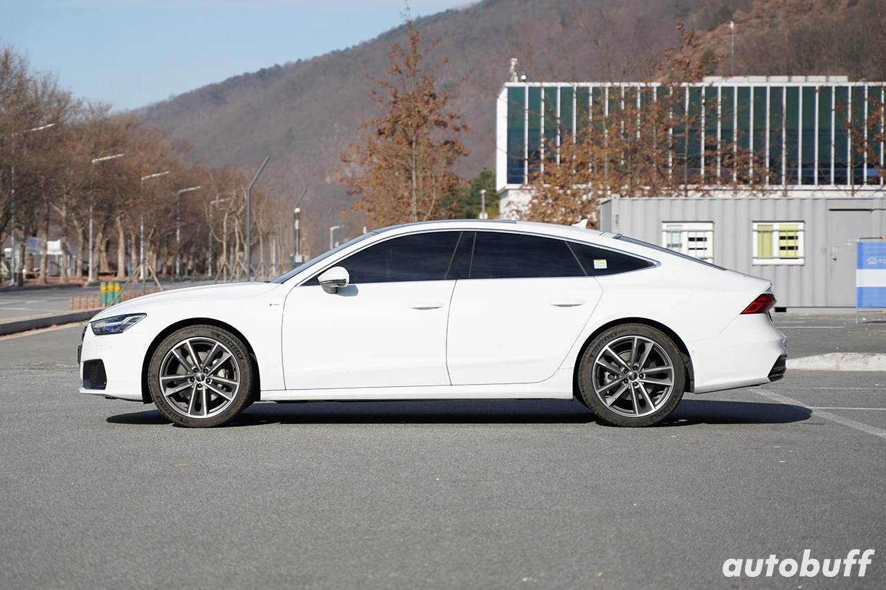 아우디 A7의 디자인 핵심이라고 할 수 있는 측면 라인은 기존의 1세대와 유사한 형태다. 루프부터 테일 게이트 끝단까지 이어지는 유려한 패스트백 라인이 A7의 상징이다. 휠은 20인치 5 더블 암 스타일 휠이 적용되었고, 시승차에의 타이어는 미쉐린의 파일럿 스포츠 4가 적용됐다.