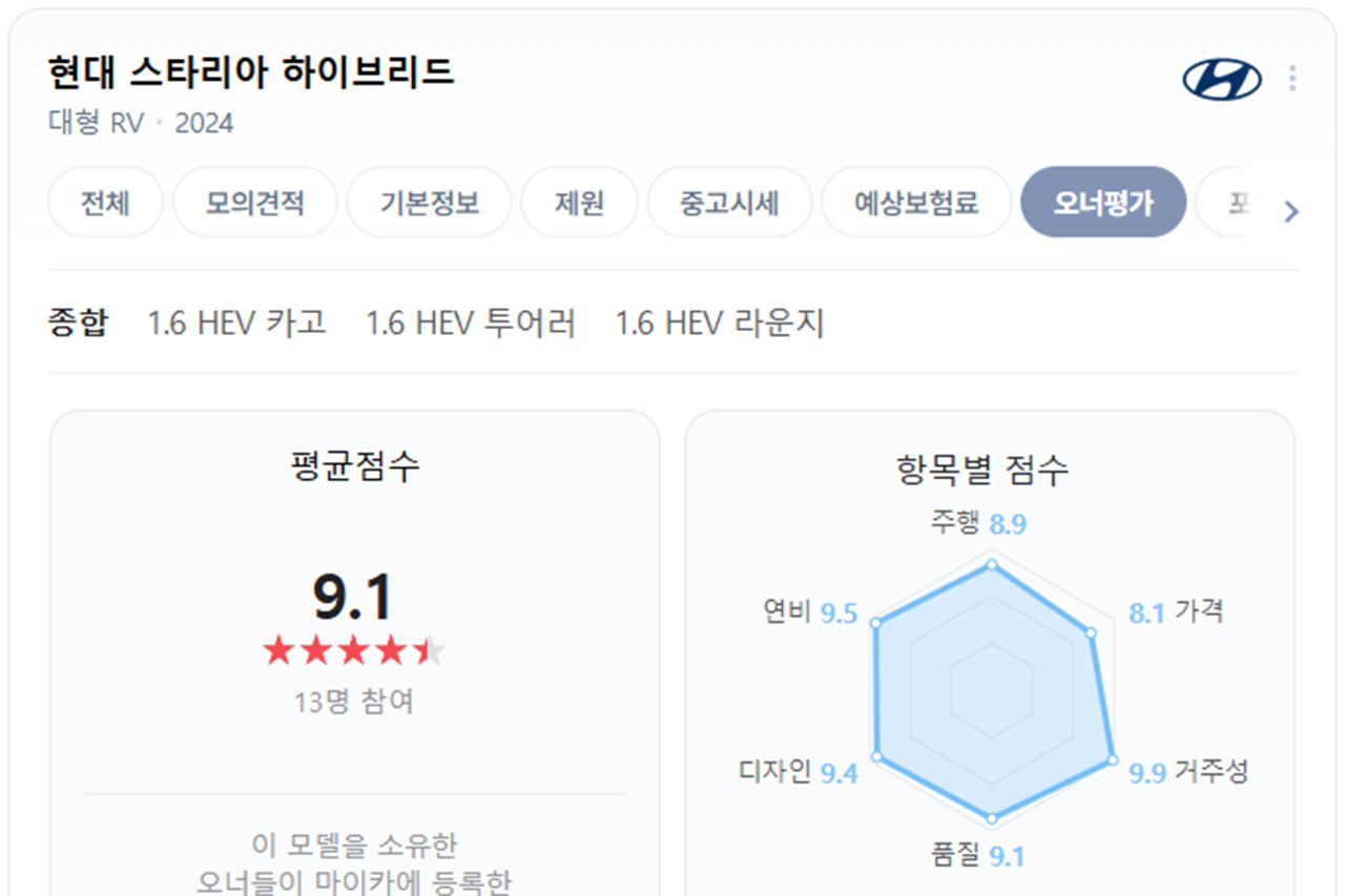 실제 차주들의 평가를 기반으로 차량 만족도 점수를 공개하는 ‘네이버 마이카 오너평가’에 따르면 현대차 스타리아 하이브리드의 오너평가 점수는 9.1점이다.