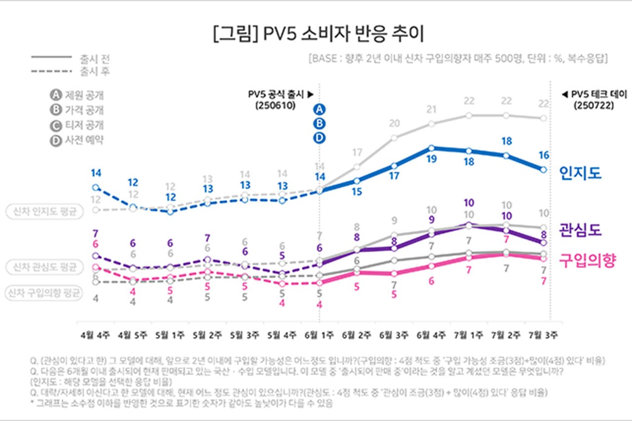 7월 3주 조사에서 ‘PV5’ 구입의향은 7%로, 2년 내 신차 구입 예정자 100명 중 7명 정도만 실제 구입을 고려한다는 뜻이다. 조사 대상 신차 13개 모델 중 9위로, 전체 평균 수준에 겨우 걸쳤다. 관심도와 인지도는 각각 평균치에도 못 미쳤으며, 특히 인지도가 평균 대비 열세가 점점 커지는 상황이다.