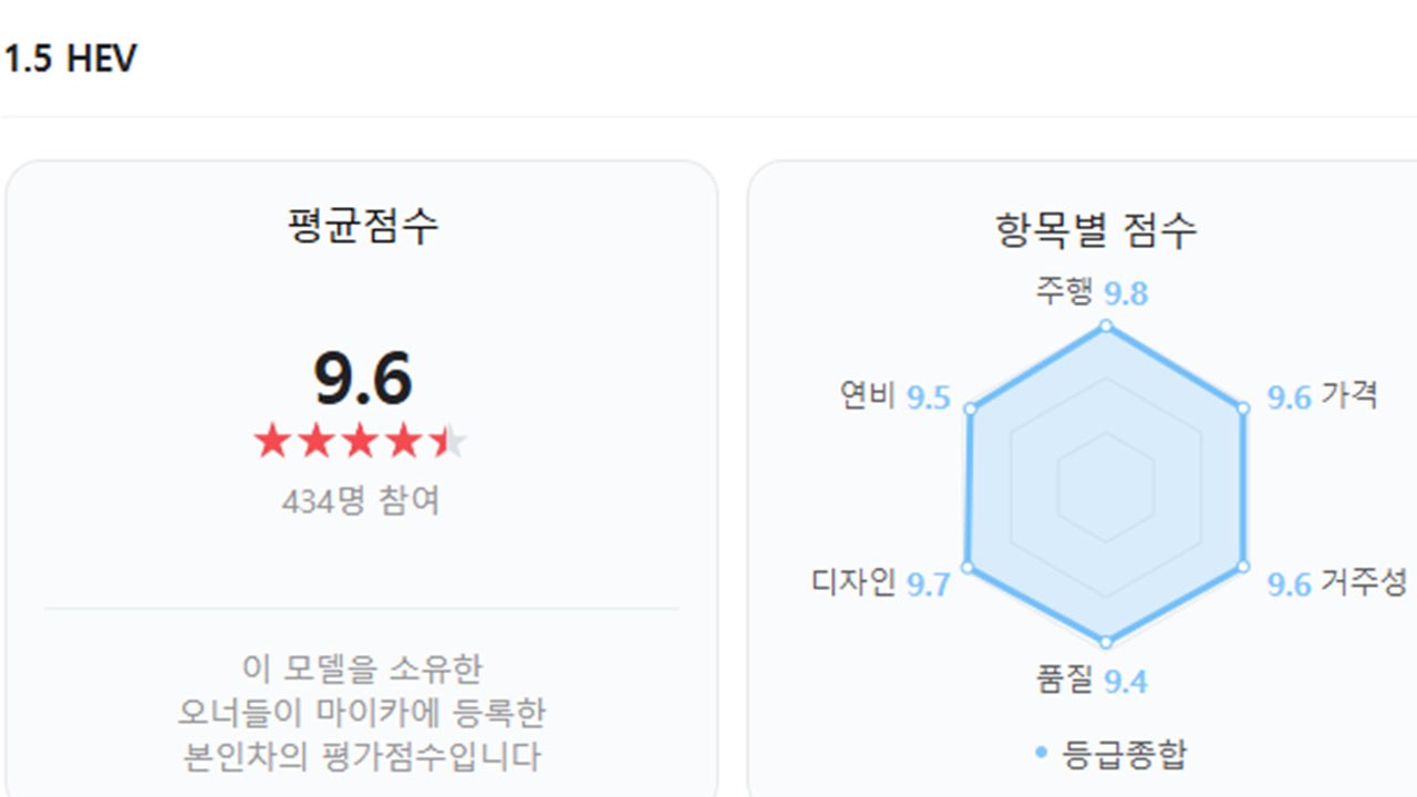 실제 차주들의 평가를 기반으로 차량 만족도 점수를 공개하는 ‘네이버 마이카 오너평가’에 따르면 르노 그랑 콜레오스 하이브리드 E-Tech의 오너평가 점수는 9.6점이다. 모든 항목이 9점 이상으로 평가됐다.