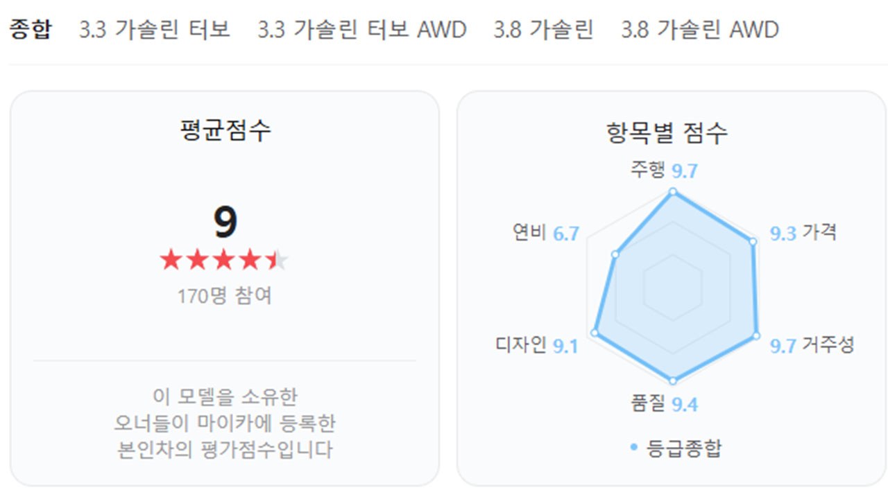 이어 품질과 가격이 각각 9.4점과 9.3점을 기록했다. 기아 K9의 판매가격은 5,871~7,882만 원대로 책정됐고, 품질에 대한 오너들의 평가를 살펴보면 “모든 면에서 괜찮은 차인 것 같습니다”, “빠지는 게 없는 완벽한 차입니다”등의 평가가 기록됐다.