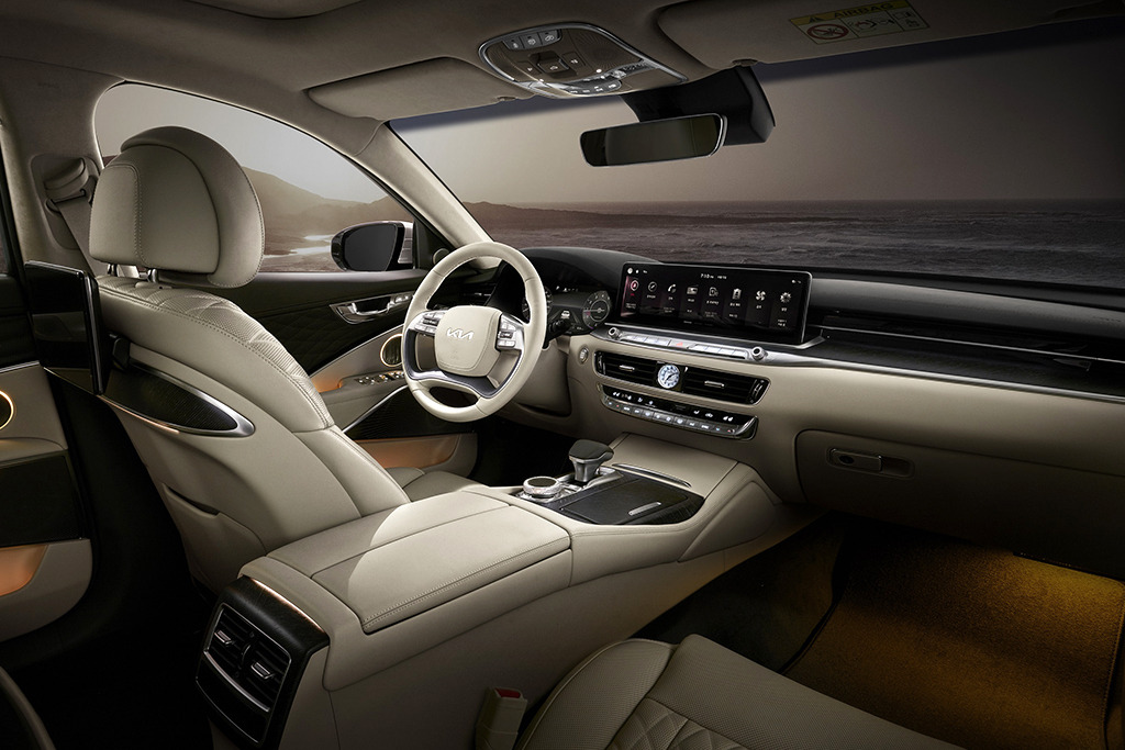 후면부는 와이드 LED 테일램프가 차량 폭을 가로지르고 기아 로고가 테일램프 아래 중앙에 배치됐다. 하단 디퓨저와 듀얼 머플러 팁이 스포티함을 더해 플래그십 감성을 완성했다. K9의 연비는 복합 8.1~9km/L다.