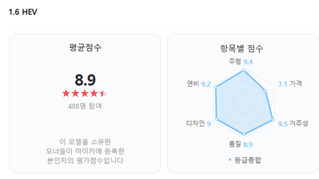 실제 차주들의 평가를 기반으로 차량 만족도 점수를 공개하는 ‘네이버 마이카 오너평가’에 따르면 현대차 그랜저 하이브리드의 오너평가 점수는 8.9점이다.