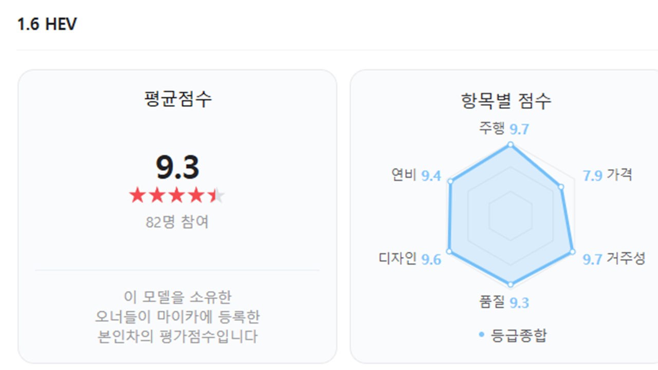실제 차주들의 평가를 기반으로 차량 만족도 점수를 공개하는 ‘네이버 마이카 오너평가’에 따르면 기아 K8 하이브리드의 오너평가 점수는 9.3점이다. 가격을 제외한 모든 항목이 9점 이상을 받아 높은 만족도를 보였다.