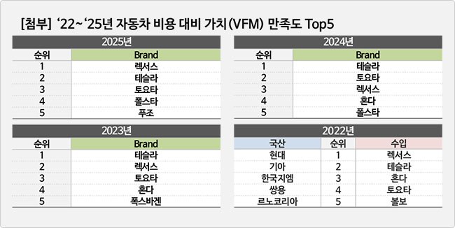 테슬라와 토요타는 만족도가 각각 8점과 9점씩 상승했음에도 렉서스에 밀려 순위가 1 계단 씩 하락했다. 테슬라는 전기차의 강점인 유지비용에서 높은 순위를 차지했고, 차량가격과 옵션가격 만족도가 함께 상승했다.