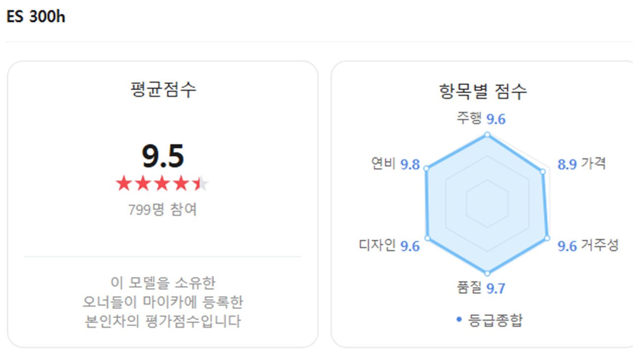 실제 차주들의 평가를 기반으로 차량 만족도 점수를 공개하는 ‘네이버 마이카 오너평가’에 따르면 렉서스 ES 하이브리드의 오너평가 점수는 9.5점이다. 가격을 제외한 모든 항목이 9.5점 이상의 매우 높은 평가를 받았다.