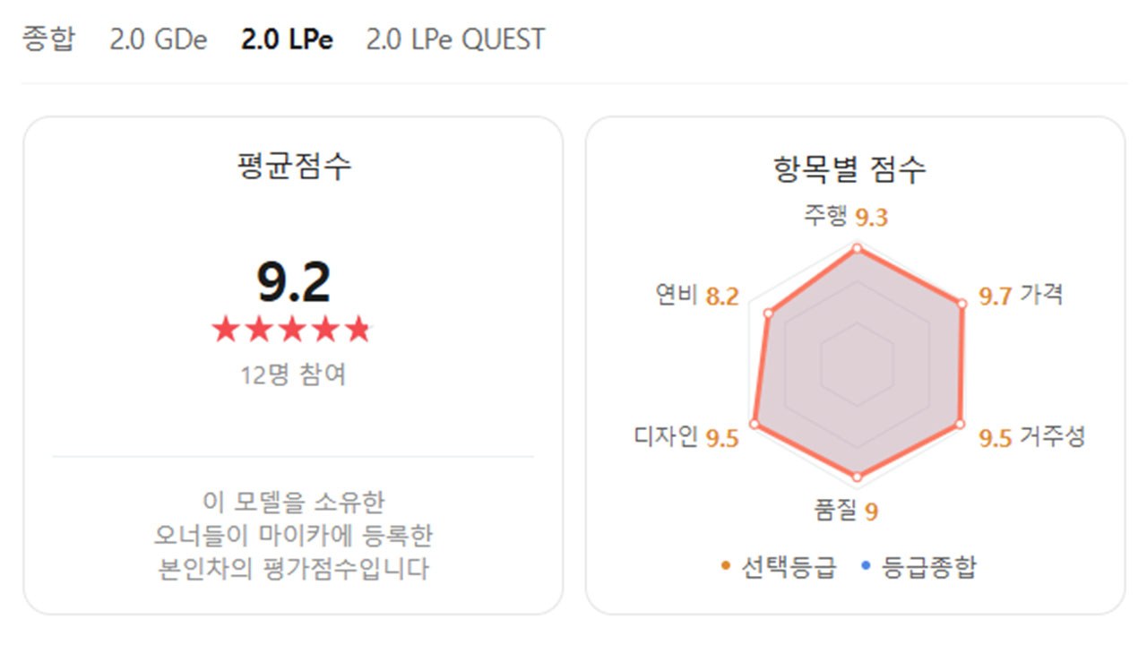 실제 차주들의 평가를 기반으로 차량 만족도 점수를 공개하는 ‘네이버 마이카 오너평가’에 따르면 르노코리아 QM6 2.0 LPe의 오너평가 점수는 9.2점이다.