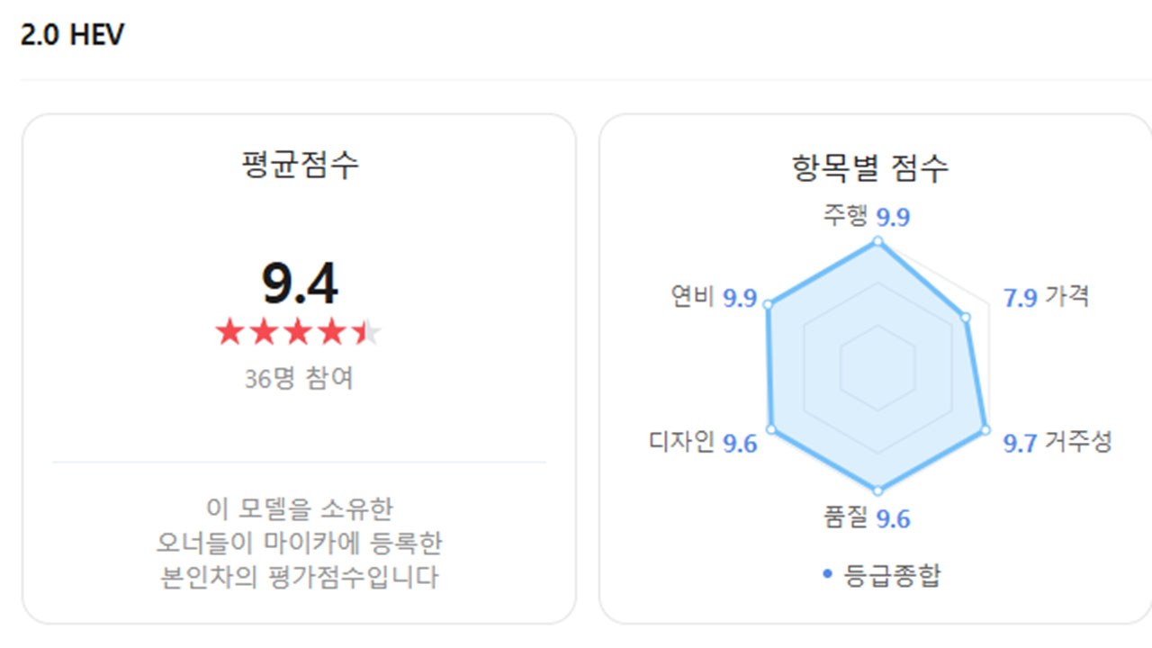 또한 “실제 연비는 23km/L 정도 나오네요”, “차의 본질인 주행성능은 단점이 없음. 가격이 많이 올랐지만 돈값하는 차. 앞으로 10년은 거뜬히 탈 듯”등의 좋은 평가가 대부분이다.