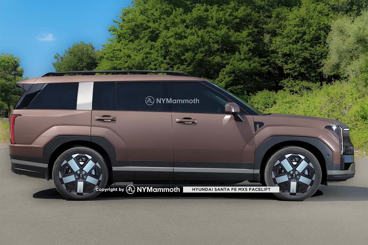 현대자동차 싼타페 페이스리프트 모델의 측면 디자인 예상도가 처음으로 공개됐다. 페이스리프트 모델인 만큼 측면 실루엣 변화는 적을 것으로 예상되지만, 디테일한 변화를 통해 새로운 분위기를 연출할 전망이다.