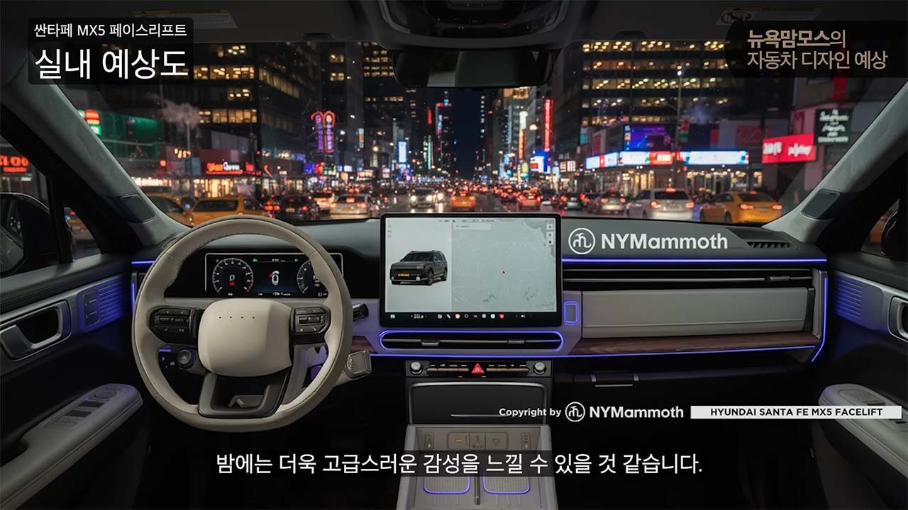 신차 예상도 유튜브 채널 ‘뉴욕맘모스’는 플레오스 커넥트 시스템이 탑재된 신형 싼타페 실내 예상도를 공개했다. ccNC 인포테인먼트 시스템 기반 와이드 디스플레이가 적용된 현행 싼타페와 사뭇 다른 실내 분위기를 완성했다.