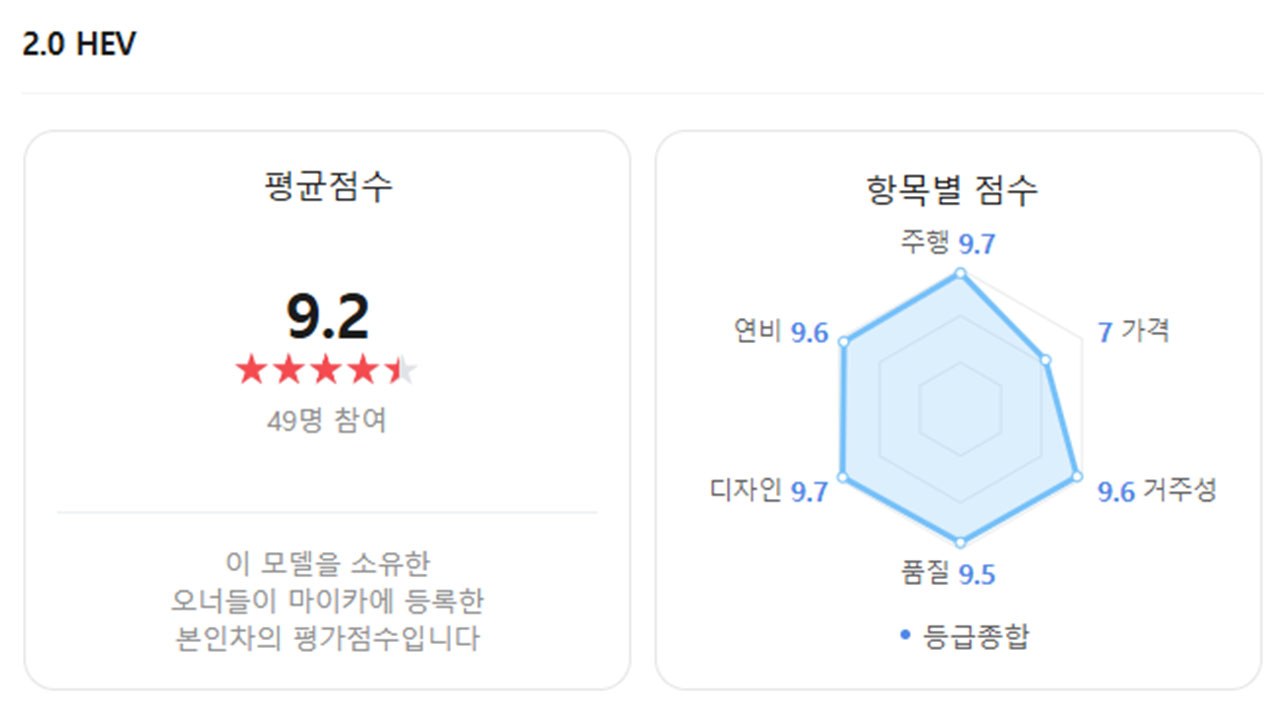 실제 차주들의 평가를 기반으로 차량 만족도 점수를 공개하는 ‘네이버 마이카 오너평가’에 따르면 기아 K5 하이브리드의 오너평가 점수는 9.2점이다. 가격을 제외한 모든 항목이 9점 이상이다.