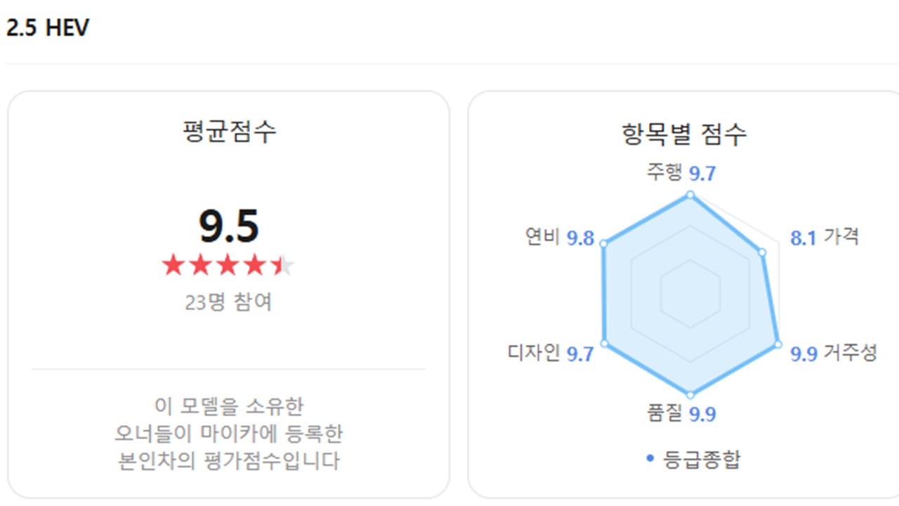 실제 차주들의 평가를 기반으로 차량 만족도 점수를 공개하는 ‘네이버 마이카 오너평가’에 따르면 토요타 캠리 하이브리드의 오너평가 점수는 9.5점이다. 가격을 제외한 모든 항목이 9점 이상의 높은 평가를 받았다.