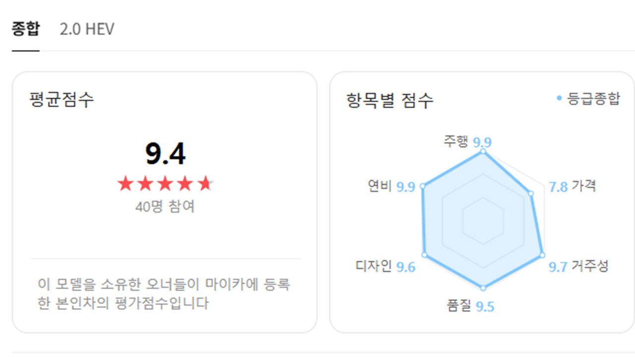 실제 차주들의 평가를 기반으로 차량 만족도 점수를 공개하는 ‘네이버 마이카 오너평가’에 따르면 혼다 어코드 하이브리드의 오너평가 점수는 9.4점이다. 가격을 제외한 모든 항목이 9.5점 이상의 높은 점수를 기록했다.