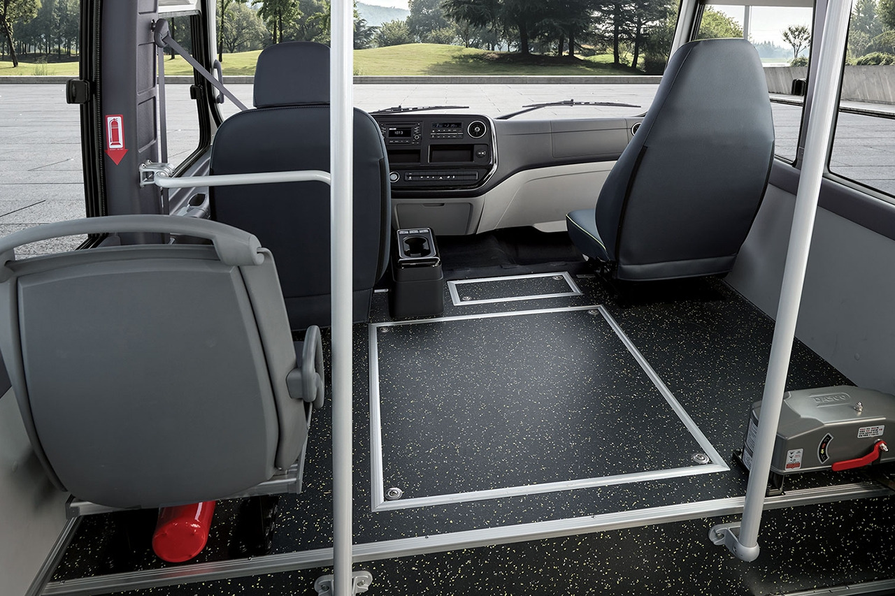 카운티 일렉트릭은 국산 최초의 중형 전기 버스로 신규 편의 사양도 다양하게 도입해 운전자와 승객 모두에게 보다 안락한 공간을 제공한다. 엔진 대신 배터리와 전기모터를 탑재, 차량 하부 공간을 확보함에 따라 기존 디젤 모델에 있던 바닥 돌출부가 사라져 승객의 출입이 쉬워졌고 개방감 있는 실내 공간을 구현했다.
