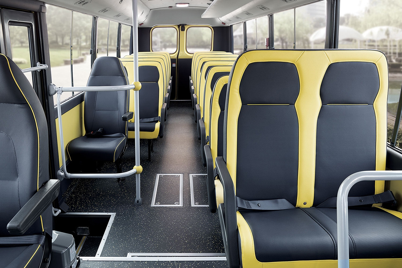 어린이버스의 경우에는 비상시 차량의 뒤쪽으로 원활하게 탈출할 수 있는 트윈 스윙 타입 후방 비상문을 적용했으며, 좌석 등받이 높이 220mm 증대, 시트 배열 변경, 복부 압박을 감소시킬 수 있는 안전벨트 방식 도입 등으로 강화된 법규를 충족시키고 안전성을 높였다.
