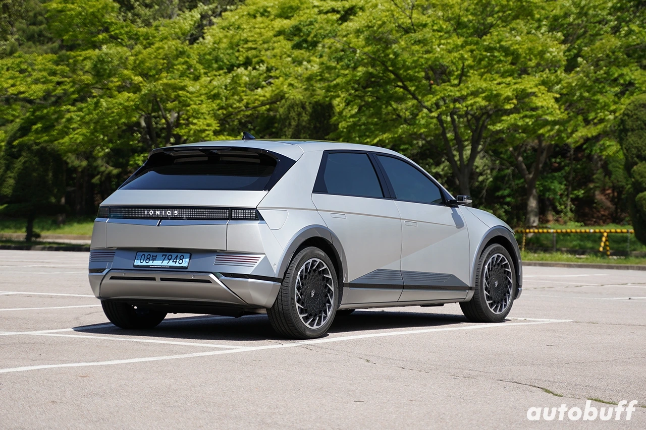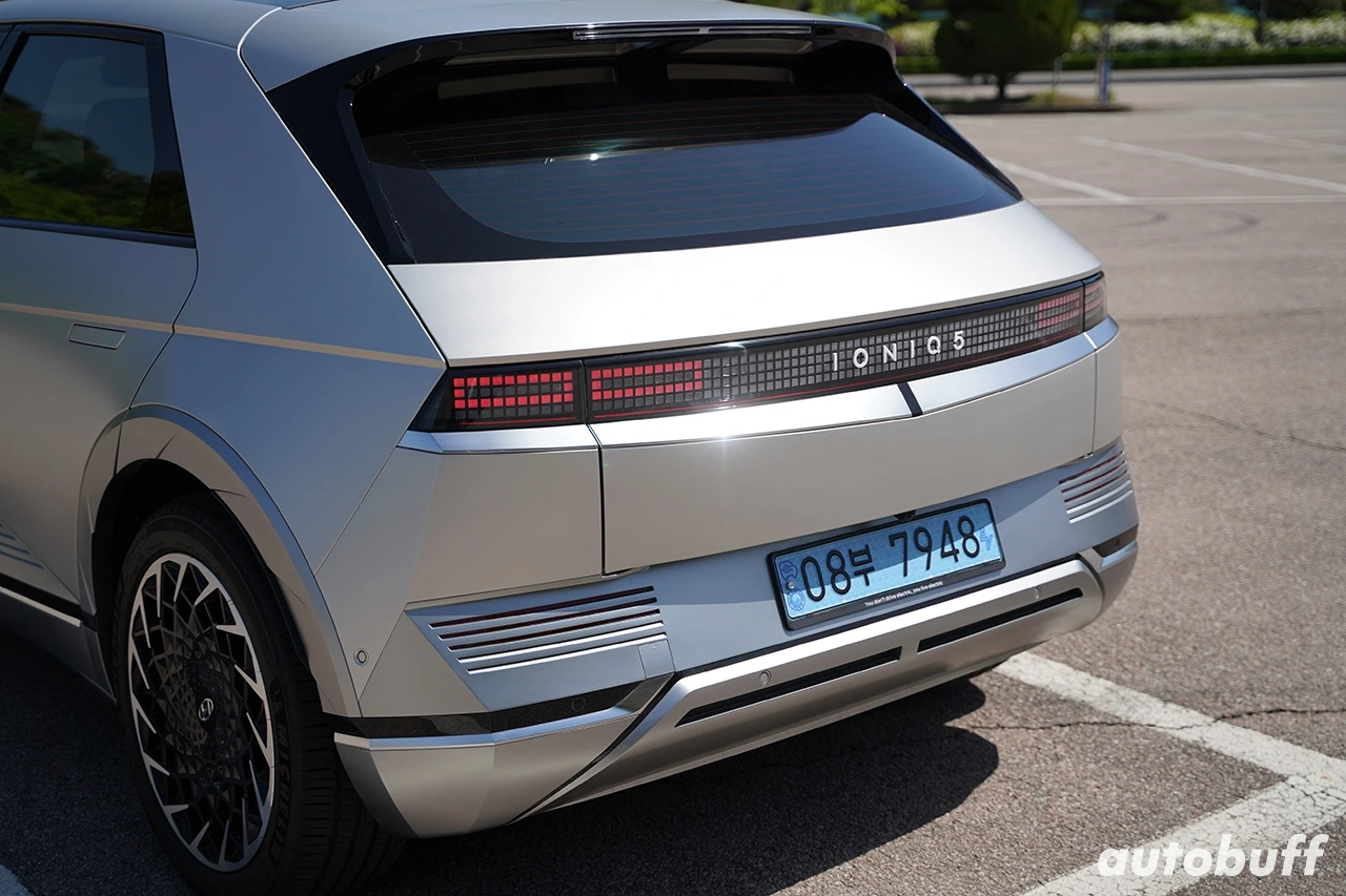 후면의 테일램프는 아이오닉 5의 독창적인 다자인의 중심인 파라매트릭 픽셀 디자인의 완성체다. 아날로그 감성이 느껴지는 도트 형태 LED 램프를 적용해 레트로한 테일램프 그래픽을 구현했다. 여기에 중앙에는 현대 앰블럼 대신 아이오닉 5 레터링을 적용해 아이오닉 브랜드를 강조했다. 의문인 점은 당연히 루프 스포일러 하단에 위치할 것으로 예상했던 리어 와이퍼가 제외된 부분이다.