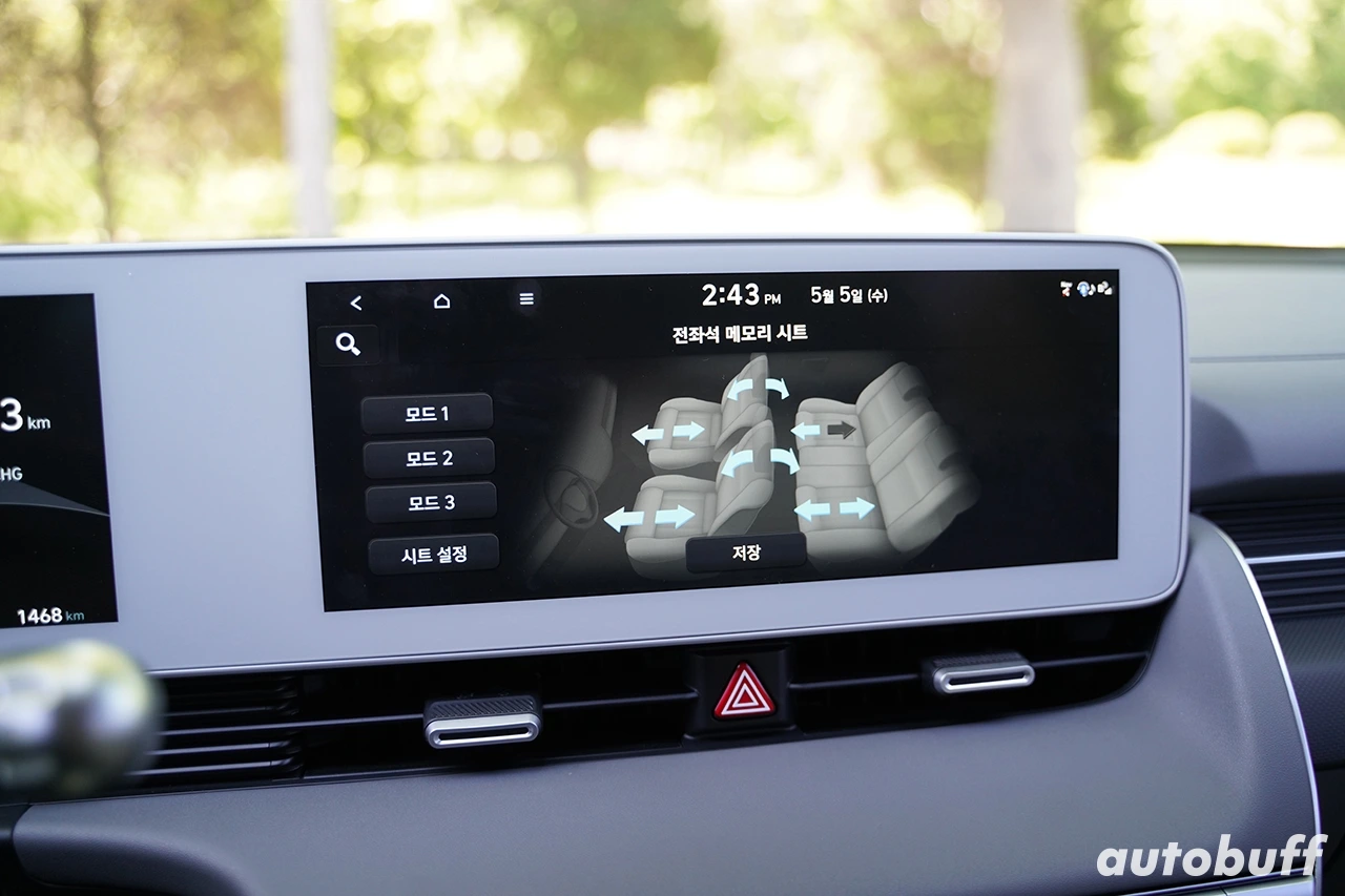 아이오닉 5는 주행 외에도 정차 중에 만족도가 컸다. 전좌석 메모리 시트는 인포테인먼트 디스플레이를 통해 전좌석을 조절할 수 있고, 총 세 가지 모드로 전체 좌석을 저장할 수 있다. 가령 모드 1은 주행에 최적화된 시트 구성, 모드 2는 동승자들이 편하게 쉴 수 있는 구성, 모드 3은 운전자를 포함한 모두가 편하게 쉴 수 있는 시트 포지션을 미리 저장해 놓고 터치 한번으로 사용이 가능하다.