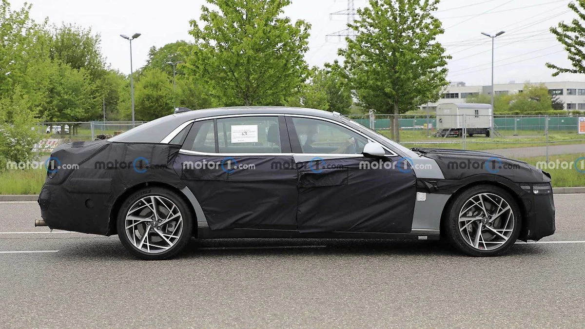 측면은 각진 형태의 대형 C 필러와 긴 휠베이스가 결합되어 전통적인 대형 세단의 중후한 스타일을 완성한다. 펜더에 적용된 것으로 예상되는 보조 방향지시등은 위장막에 가려져 있으며, 바람개비 패턴의 역동적인 휠을 적용해 전반적으로 중후한 모습에 스포티한 감성을 더했다.
