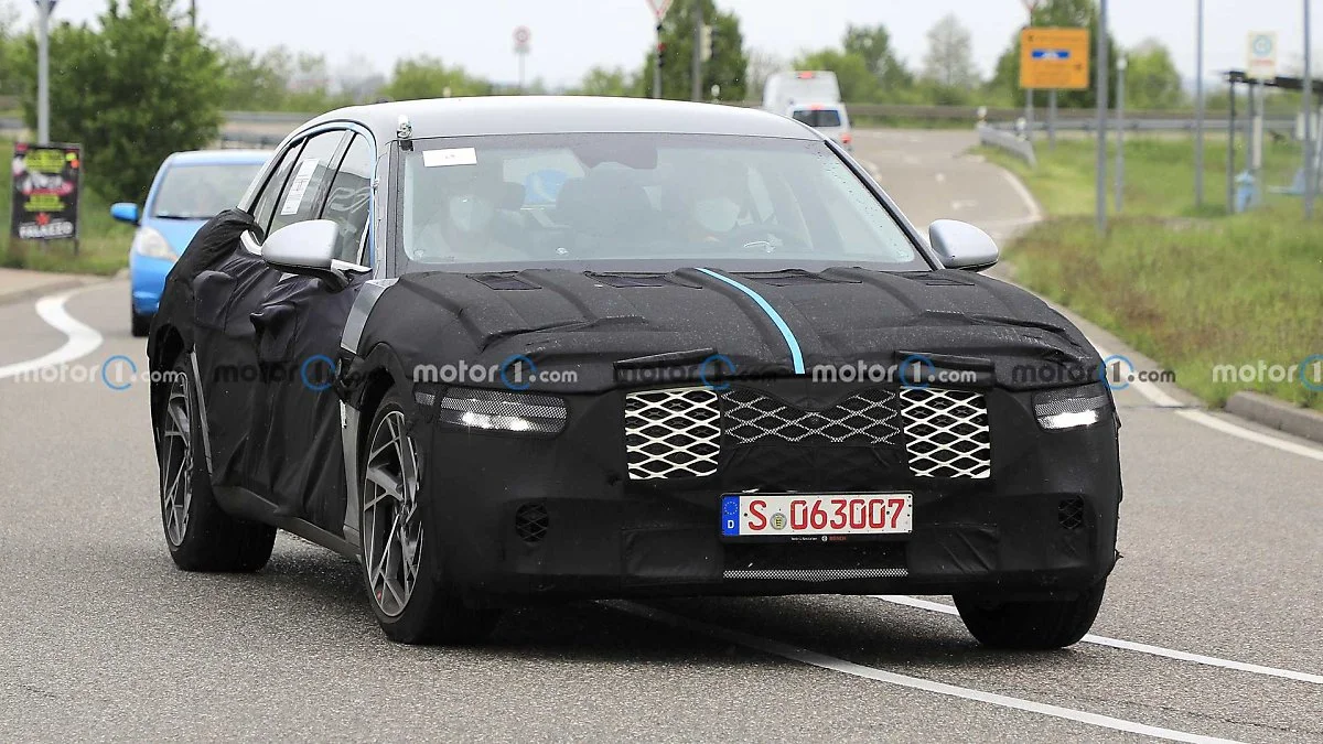 독일 공도에서 포착된 G90의 전면부는 위장막 사이 공간을 꽉 채우는 대형 크레스트 그릴과 제네시스 브랜드의 쿼드램프가 적용된 것을 확인할 수 있다. 또한 전면 그릴 양쪽의 위장막을 걷어 놓았는데, 반자율 주행 기술을 위한 센서가 적용된 것으로 예상된다.