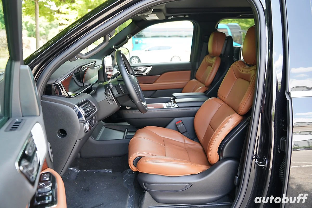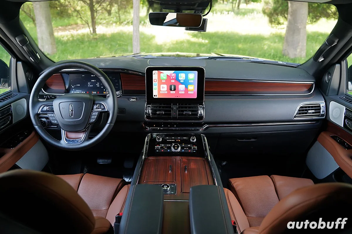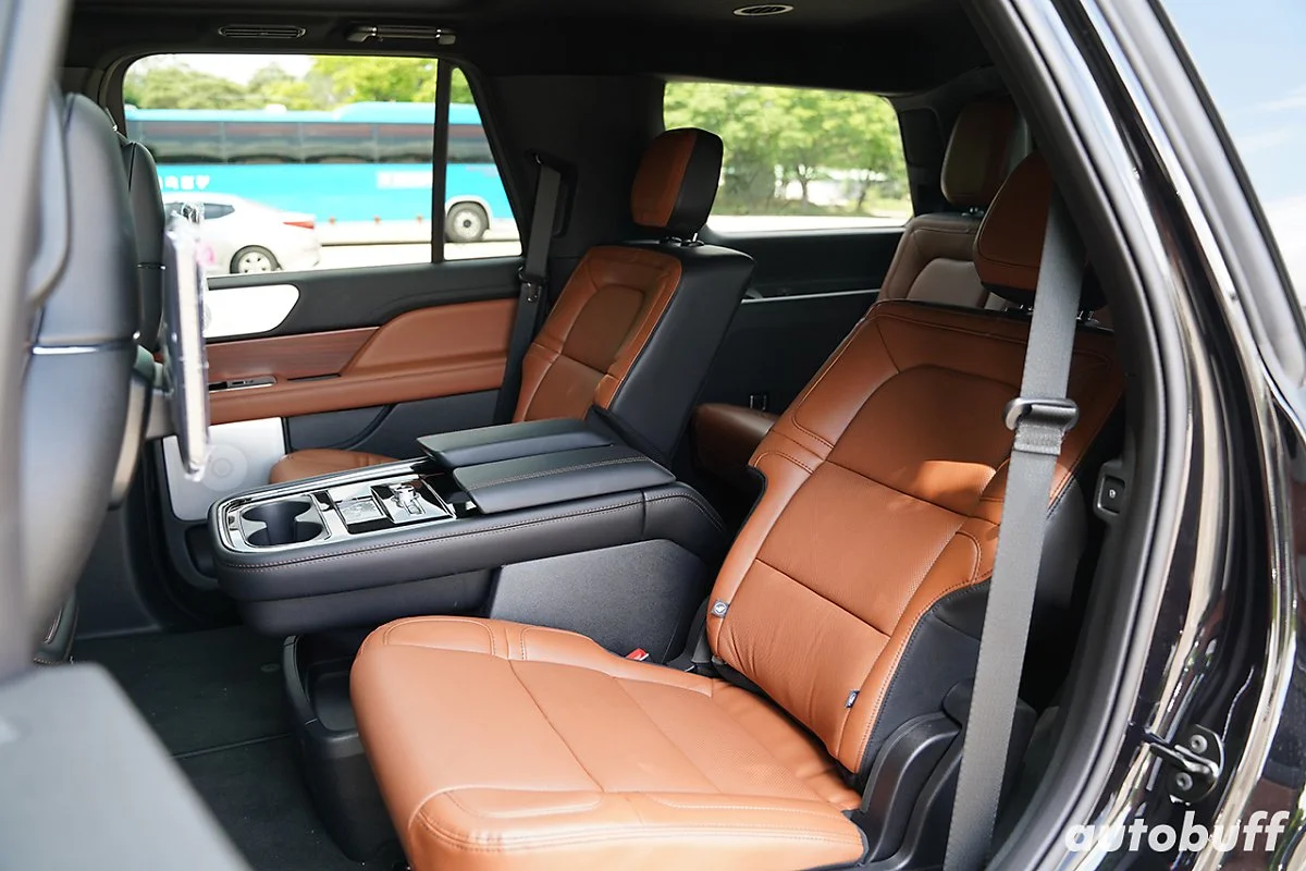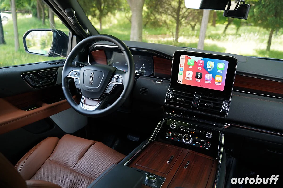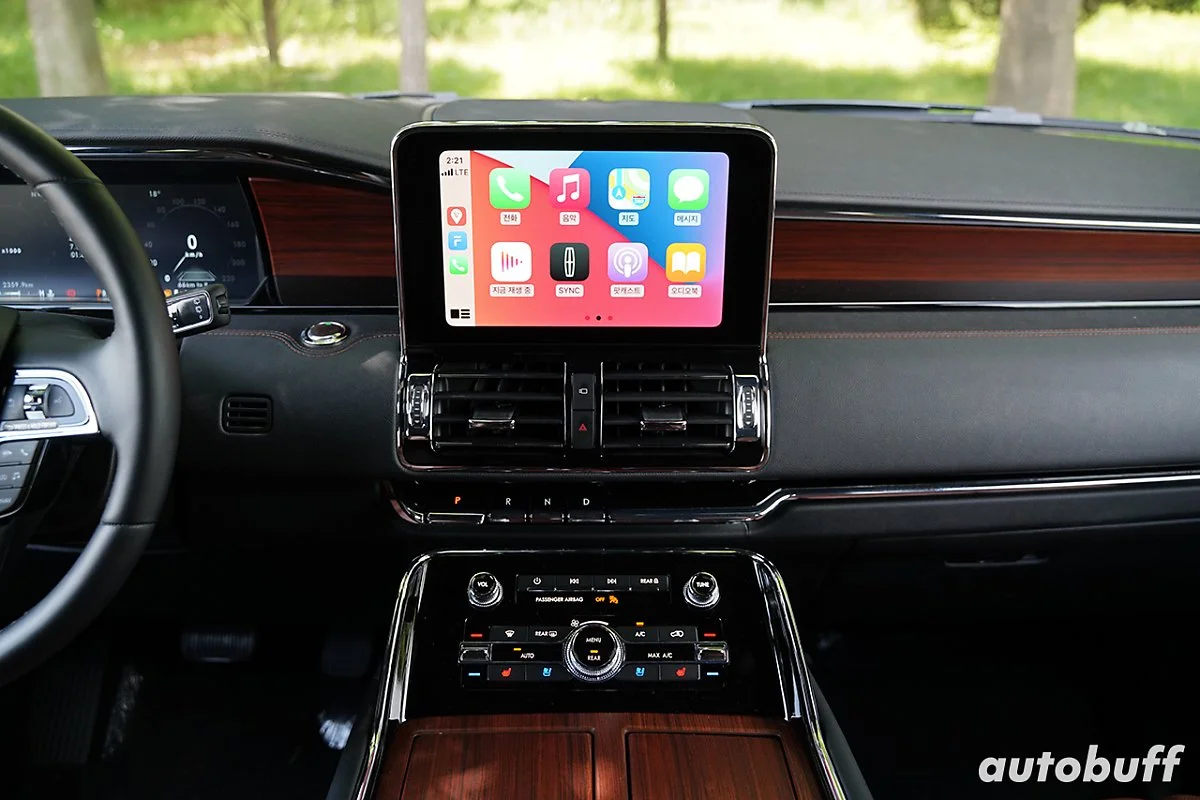실내로 들어서면 링컨 SUV의 최신 인테리어 컨셉이 반영된 것을 확인할 수 있다. 12인치 디지털 계기판과 10인치 인포테인먼트 디스플레이가 적용되었는데, 넓은 실내 때문에 작게 느껴질 정도다. 변속 레버는 피아노 건반 방식의 전자식 변속 버튼이 적용되었고, 스마트폰 무선충전기와 컵홀더가 위치한 센터콘솔은 여유로운 크기를 자랑한다.