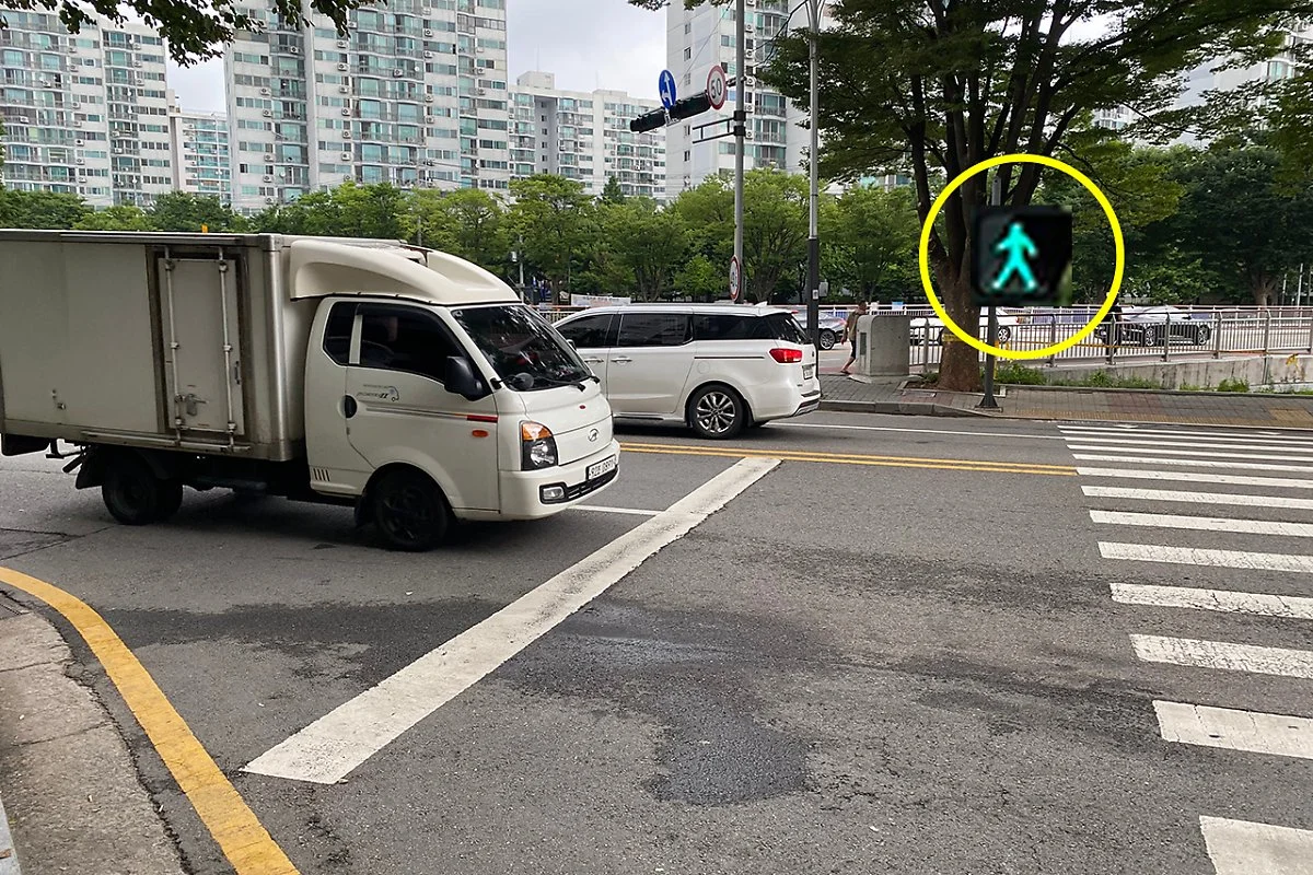 다만 모든 경우에 정차해야하는 것은 아닙니다. 교차로 우회전 시 운전자 기준 전방 차량 신호가 빨간불이거나 보행자 신호가 초록불일 때에는 차를 일시 정지하고 보행자가 없으면 천천히 우회전할 수 있습니다. 이후 우회전 중에 만나는 보행자의 신호가 초록불일 경우에는 보행자가 있을 때에는 일시 정지, 주변 보행자가 없는 경우에는 서행으로 통과하면 됩니다. 여기서 서행은 즉시 차량을 멈출 수 있을 정도의 속도입니다.