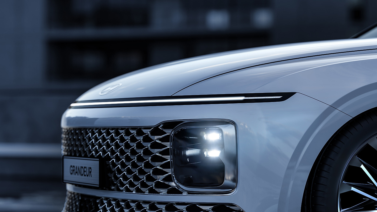 신형 그랜저의 전면부는 하나의 ‘끊김없이 연결된 수평형 램프(Seamless Horizon Lamp)’가 적용됐다. 스타리아와 비슷한 모습이지만, 스타리아와 달리 끊김이 없는 수평형 램프 디자인을 사용해 기술과 예술의 완벽한 조화를 이뤄내고, 그랜저만의 미래지향적 인상을 구축했다.