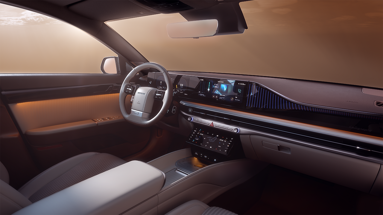 운전석에 자리잡은 스티어링 휠 또한 1세대 그랜저의 원 스포크 디자인에서 영감을 받아 조작계를 통합한 형태로 재탄생시켜, 탑승객의 시선을 사로잡음과 동시에 운전자에게 최적화된 레이아웃을 구현했다. 또한 스티어링 휠로 옮겨진 기어 노브 덕분에 정갈히 비워진 콘솔 공간은 깔끔한 실내 이미지와 더불어 고객의 다양한 라이프스타일에 맞춘 다양한 수납편의성을 제공한다.
