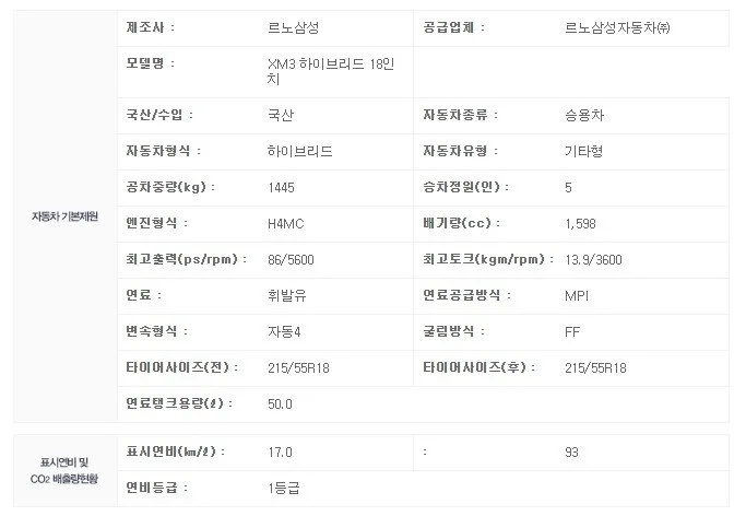 올해 하반기 출시를 앞둔 르노코리아 XM3 E-TECH 하이브리드(이하 XM 하이브리드)의 연비가 공개됐다. 한국에너지공단 자료에 따르면 XM3 하이브리드의 공인 연비는 17인치 휠 기준 17.4km/L, 18인치 휠 기준 17km/L로 인증을 마쳤다.