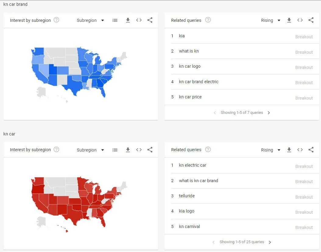 구글 트렌드 데이터는 호주, 캐나다, 영국 등 영어권 사람들이 KN SUV, KN Car Brand(KN 자동차 브랜드), KN Car Price(KN 자동차 가격)와 같은 검색 오류를 확인할 수 있다. 이런 현상은 미국에서도 비슷하며, 미국에서는 ‘KN Telluride(KN 텔룰라이드)’, ‘What is KN(KN이 무엇인가)’ 등의 검색이 이어지고 있는 것으로 확인됐다.