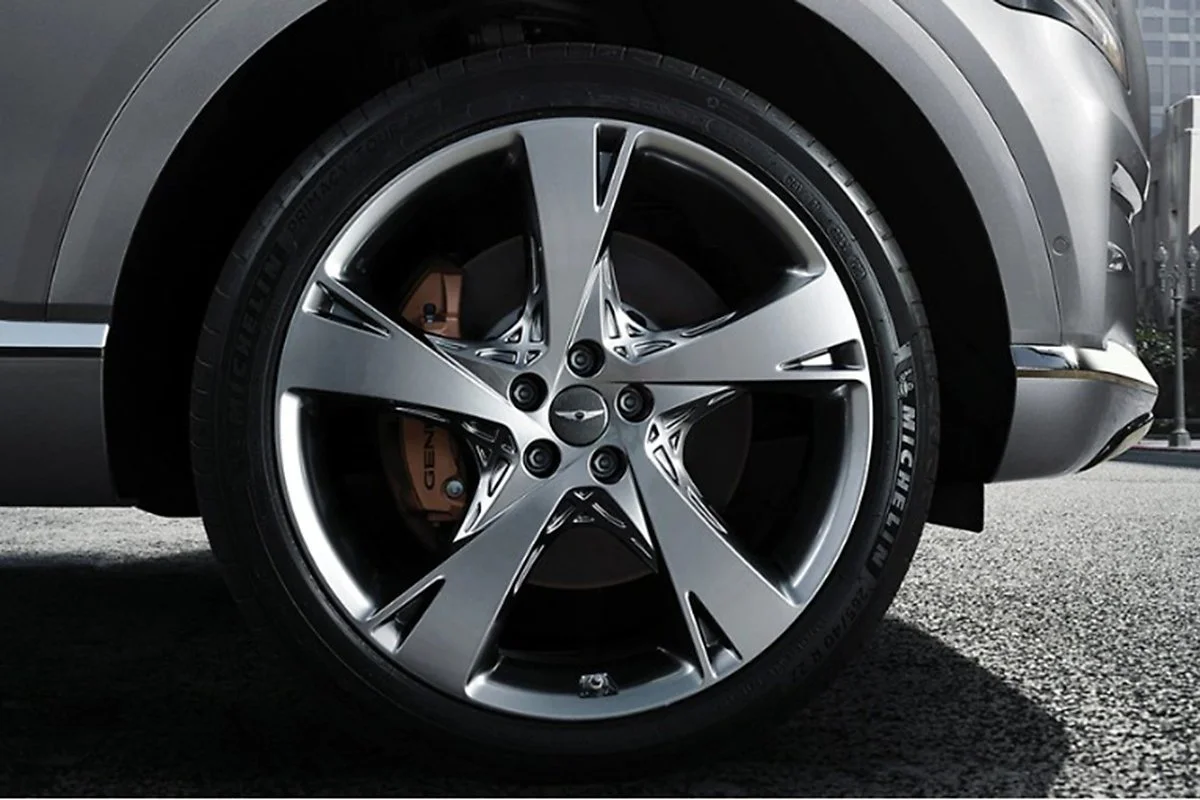 2023년형 GV80의 외관은 기존 모델과 대부분 동일한데, 디테일한 부분이 업그레이드됐다. 20인치, 22인치 휠 옵션을 선택할 경우 후륜 브레이크 캘리퍼에 스타일링 커버가 추가된다. 기본 사양인 19인치 휠은 적용되지 않는다. 기존 모델은 전륜 캘리퍼에만 ‘Genesis’ 레터링이 삽입되었는데, 휠 옵션 선택 시 후륜 캘리퍼에도 적용되어 한층 디자인 완성도를 높였다.