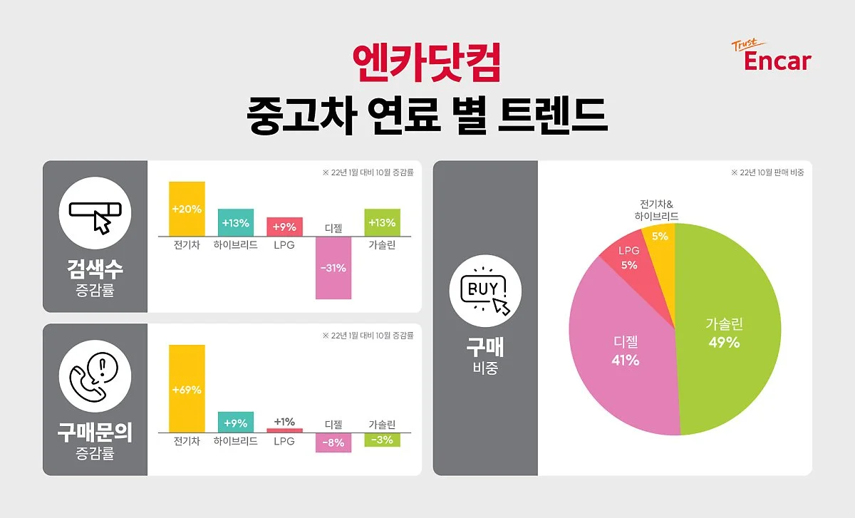 엔카닷컴이 올해 1월부터 10월까지의 중고차 빅데이터를 연료 별로 분석한 결과, 친환경차에 대한 소비자 관심이 꾸준히 증가하고 있는 것으로 나타났다. 엔카닷컴 빅데이터에 따르면 전기차와 하이브리드의 구매 비중은 아직 적지만, 소비자 검색과 구매 문의는 꾸준히 늘고 있는 것으로 확인됐다. 반면 가솔린과 디젤차 거래 비중은 여전히 높지만, 검색량과 구매 문의는 감소한 것으로 분석됐다.