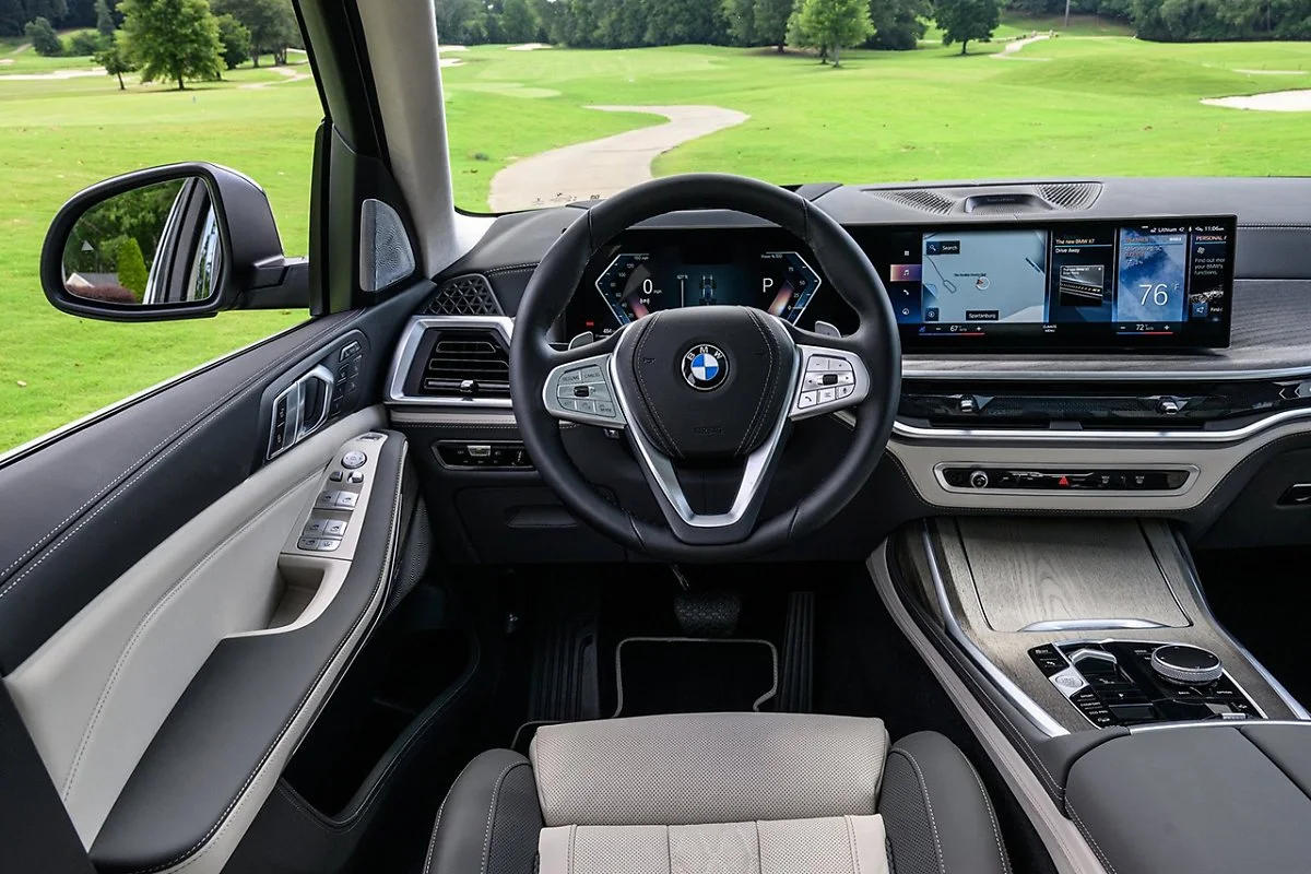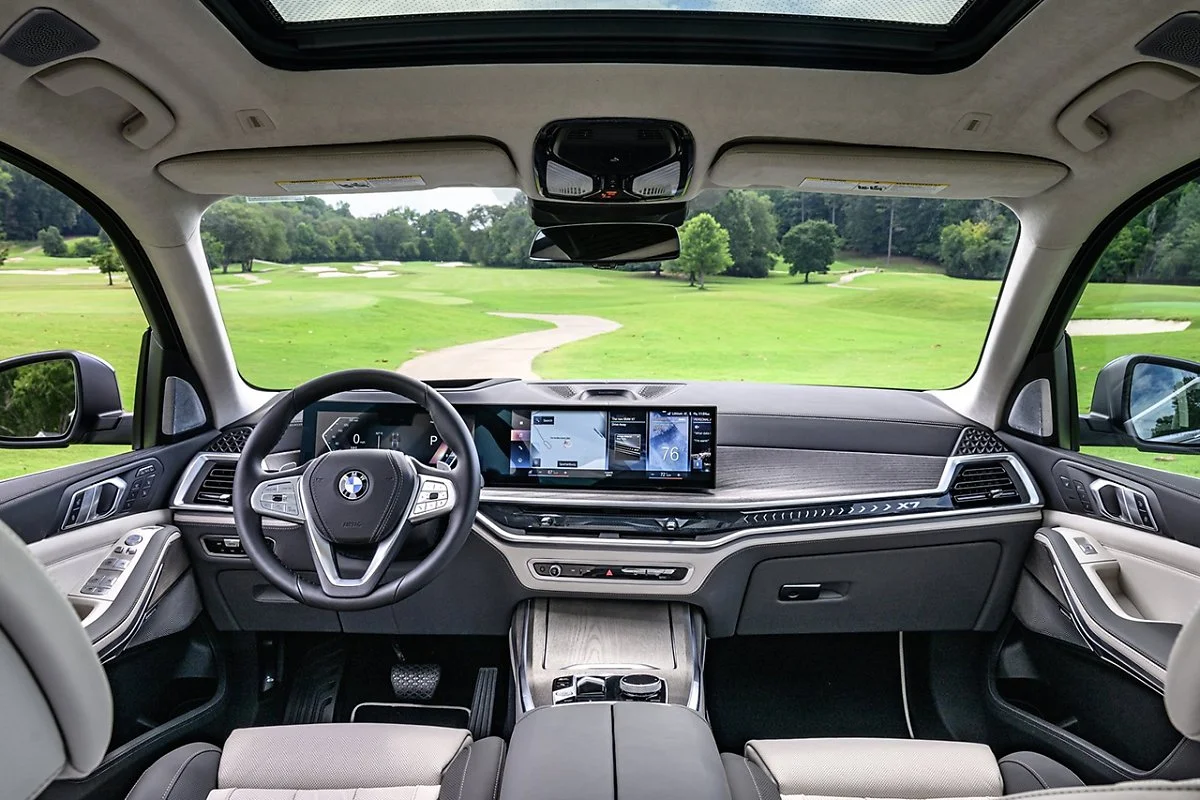 BMW 뉴 X7의 실내는 더욱 미래적이면서도 럭셔리하게 진화했다. 먼저 대시보드 위에는 최신 BMW 커브드 디스플레이가 장착된다. 12.3인치 인포메이션 디스플레이와 14.9인치 컨트롤 디스플레이로 구성된 BMW 커브드 디스플레이는 운전자 중심으로 설계되어 드라이빙에 집중할 수 있도록 돕는다. 간결한 디자인의 센터페시아와 새로운 기어 셀렉터 레버가 적용된 센터콘솔은 앞좌석에 한층 여유로운 공간감을 제공한다.