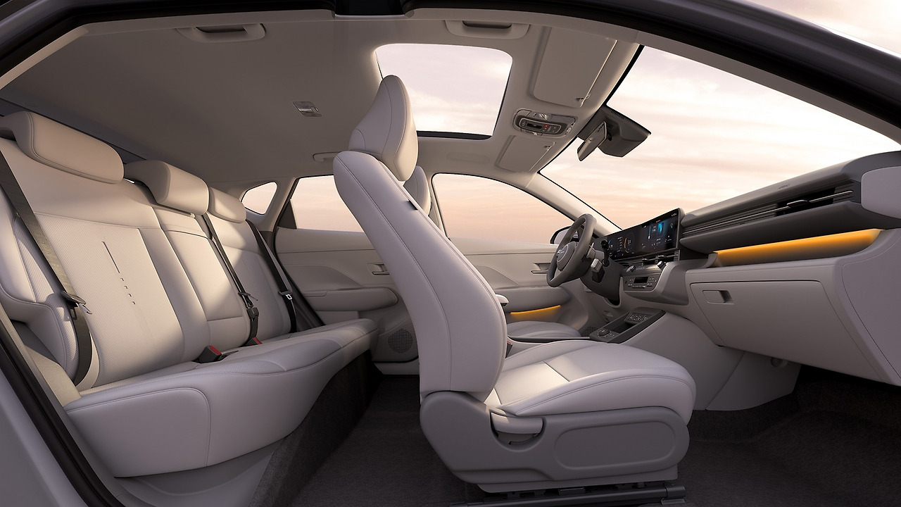 함께 공개된 신형 코나 일렉트릭의 실내는 12.3인치 듀얼 와이드 디스플레이와 함께 운전자 중심적으로 디자인된 것이 특징이다. 듀얼 와이드 디스플레이는 하이테크한 분위기를 연출하고, 수평형 레이아웃의 크래시패드는 전방 시계를 확보해주고, 넓은 공간감을 극대화해준다.