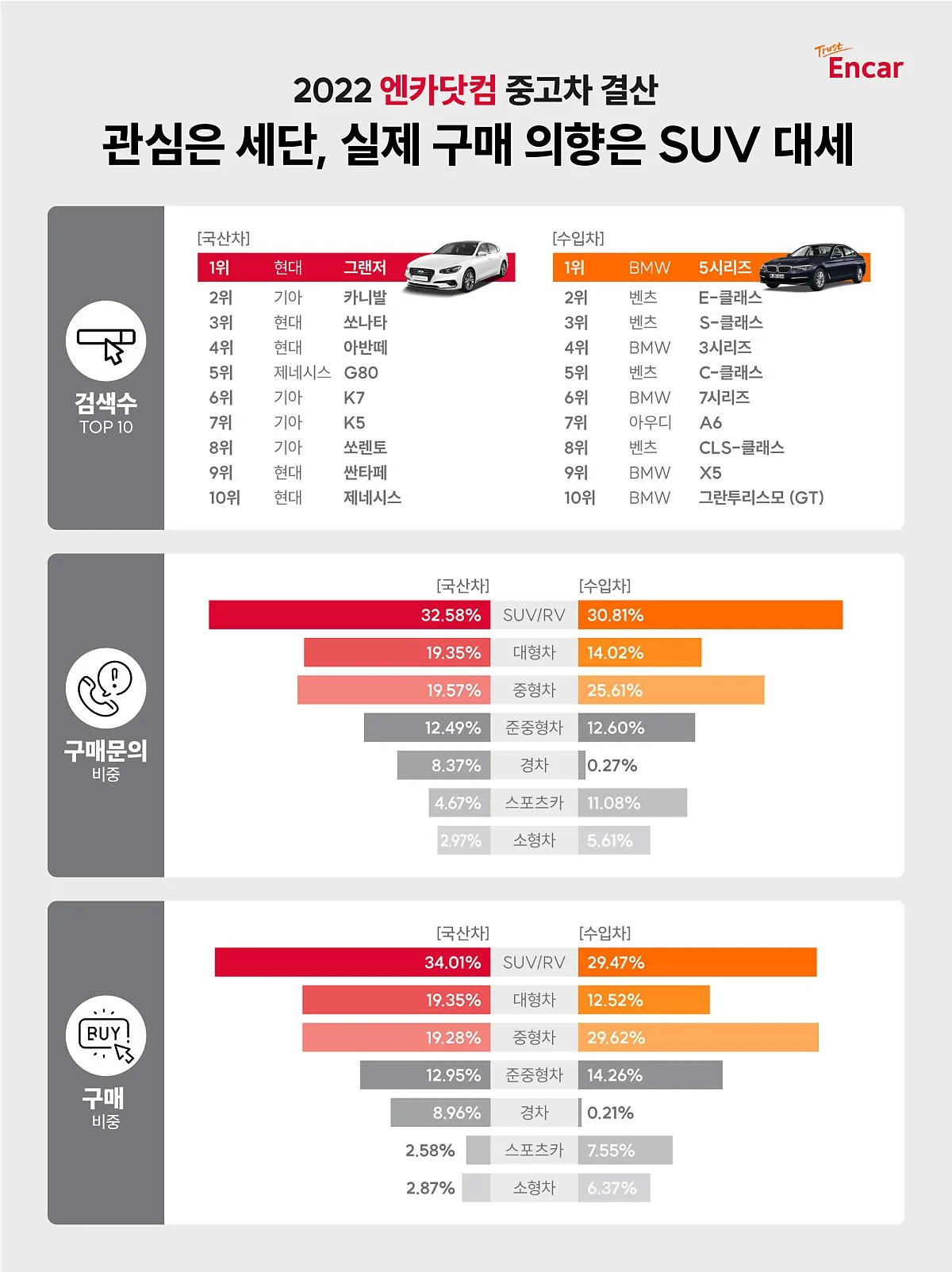 엔카닷컴이 2022년 한 해 중고차 빅데이터를 분석한 결과, 초기 관심 차종은 세단, 실제 구매 의향은 SUV/RV인 것으로 나타났다. 엔카닷컴은 2022년 한 해 소비자 중고차 트렌드를 확인할 수 있는 ‘자동차 검색 TOP 10’과 ‘차종 별 구매문의’ 데이터를 분석했다. 해당 데이터는 올해 엔카 홈페이지 및 모바일 앱을 통해 거래된 100만대 이상의 중고차 데이터를 기반으로 분석됐다.