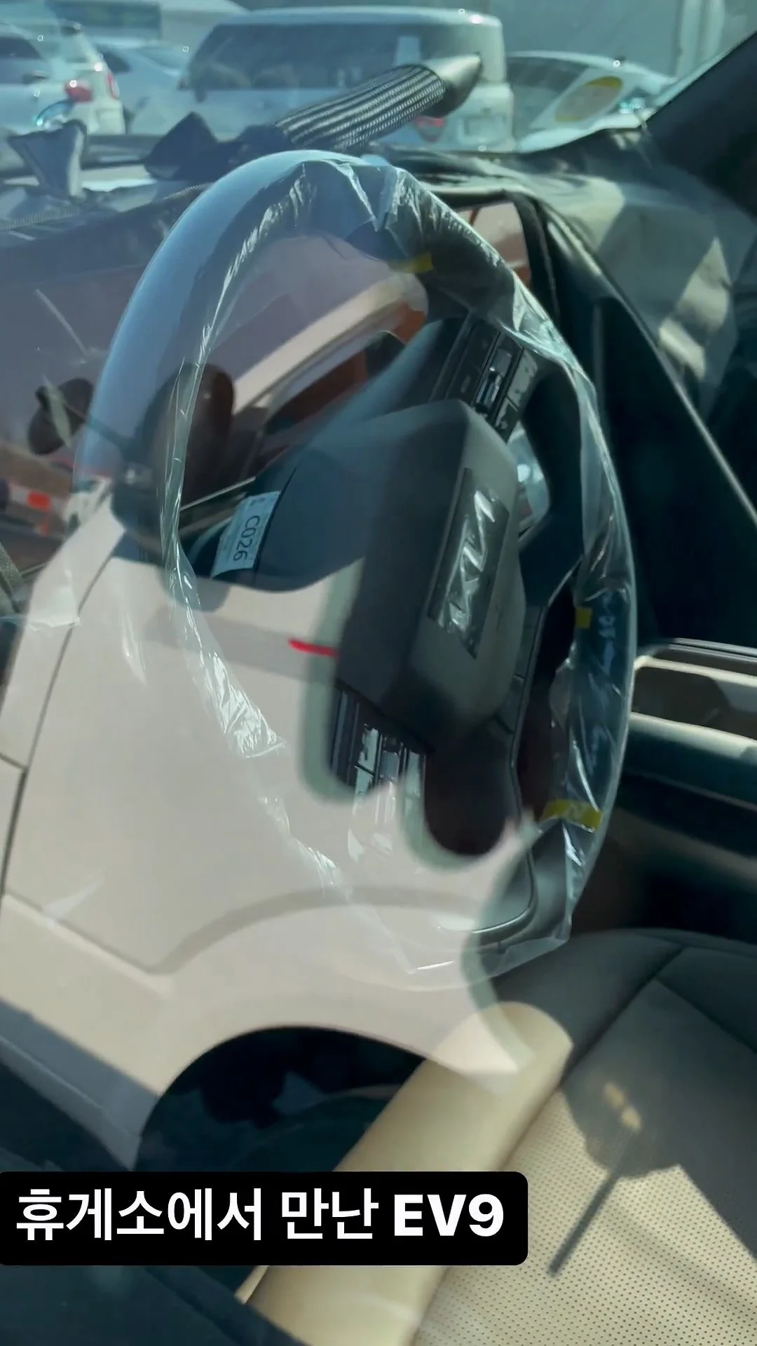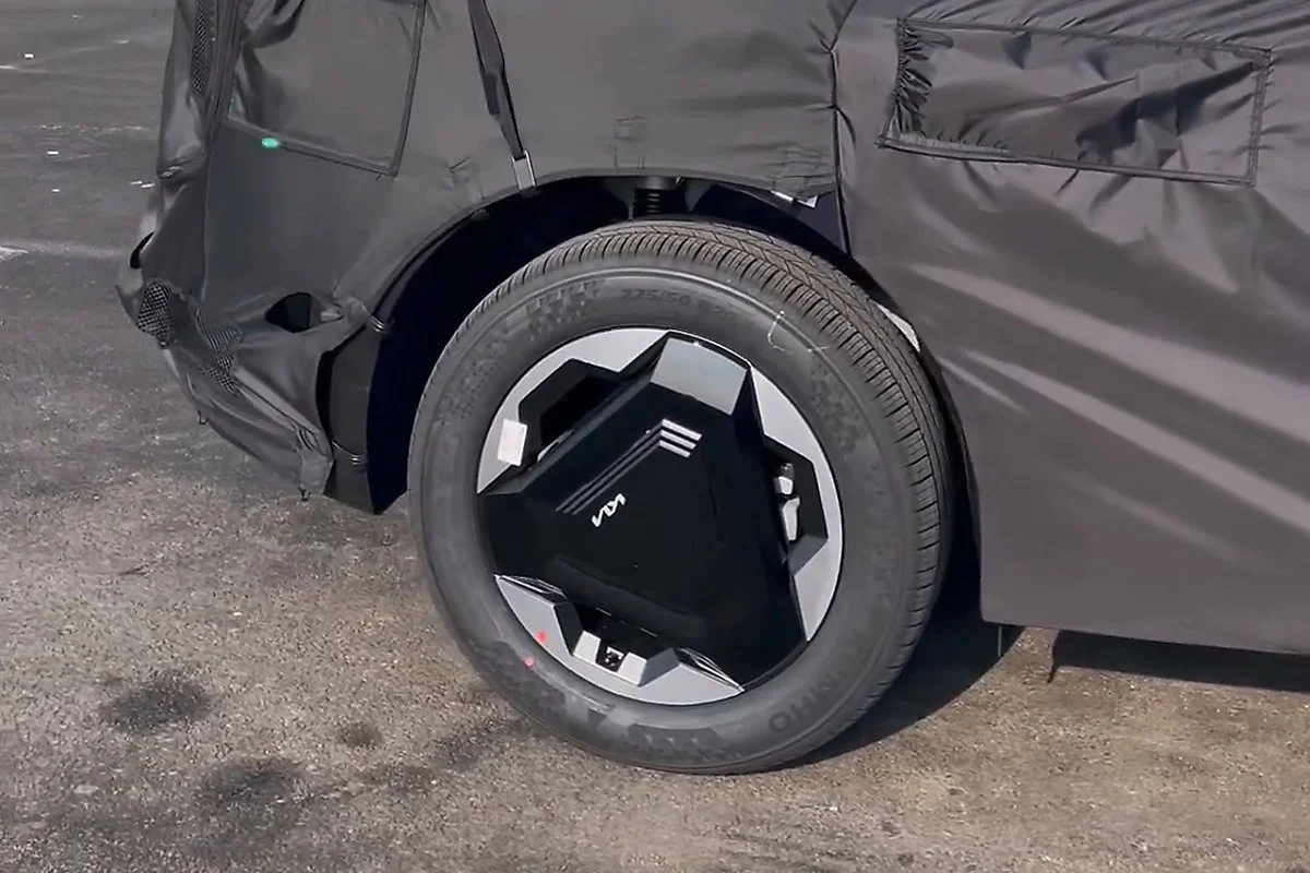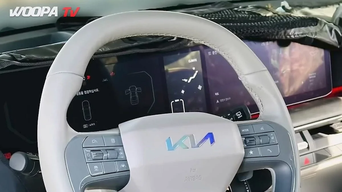 인스타그램 유저 @paul.in.ove.2020님이 게재한 EV9 영상 속에는 위장막으로 가려진 EV9의 모습과 실내 레이아웃 일부가 담겼다. EV9의 스티어링 휠은 4스포크 타입으로 기아 K9의 레이아웃과 비슷하지만, 혼 커버, 버튼 디자인 등이 조금 더 각진 형태로 변경됐다. 스티어링 휠 뒤쪽으로는 좌우로 길게 연결된 와이드 디스플레이가 적용된다.