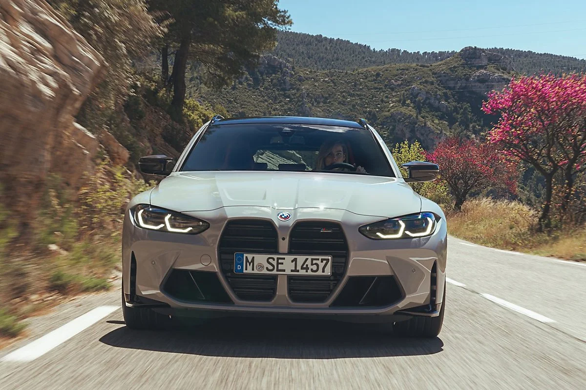 뉴 M3 투어링의 외관은 현대적인 감각과 M 특유의 역동적인 디자인 요소들이 결합돼 스포티한 매력을 발산한다. 먼저 앞면에는 수직형 프레임리스 BMW 키드니 그릴과 날렵한 디자인의 BMW 레이저 라이트, 하단의 대형 공기 흡입구가 조화를 이뤄 강렬한 모습을 완성했다.