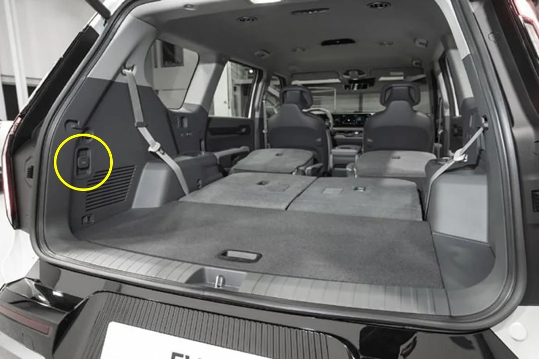 EV9의 트렁크에는 트렁크 개폐 버튼이 추가됐다. 일반적으로 기존 차량들은 트렁크 개폐를 위해 운전석 좌측 하단 버튼이나, 트렁크 외부 버튼, 스마트 키를 활용해야 됐다. 하지만 EV9은 트렁크 내부에도 전동식 트렁크 버튼을 추가해 차박 등 특수한 상황에서 트렁크 개폐 편의성을 높였다. 또한 트렁크 개폐 버튼은 커버를 추가해 적재물로 인해 버튼이 눌리는 것을 방지했다.
