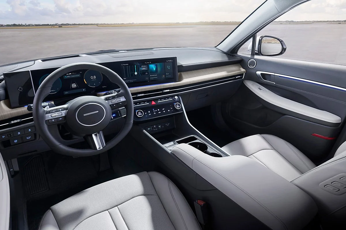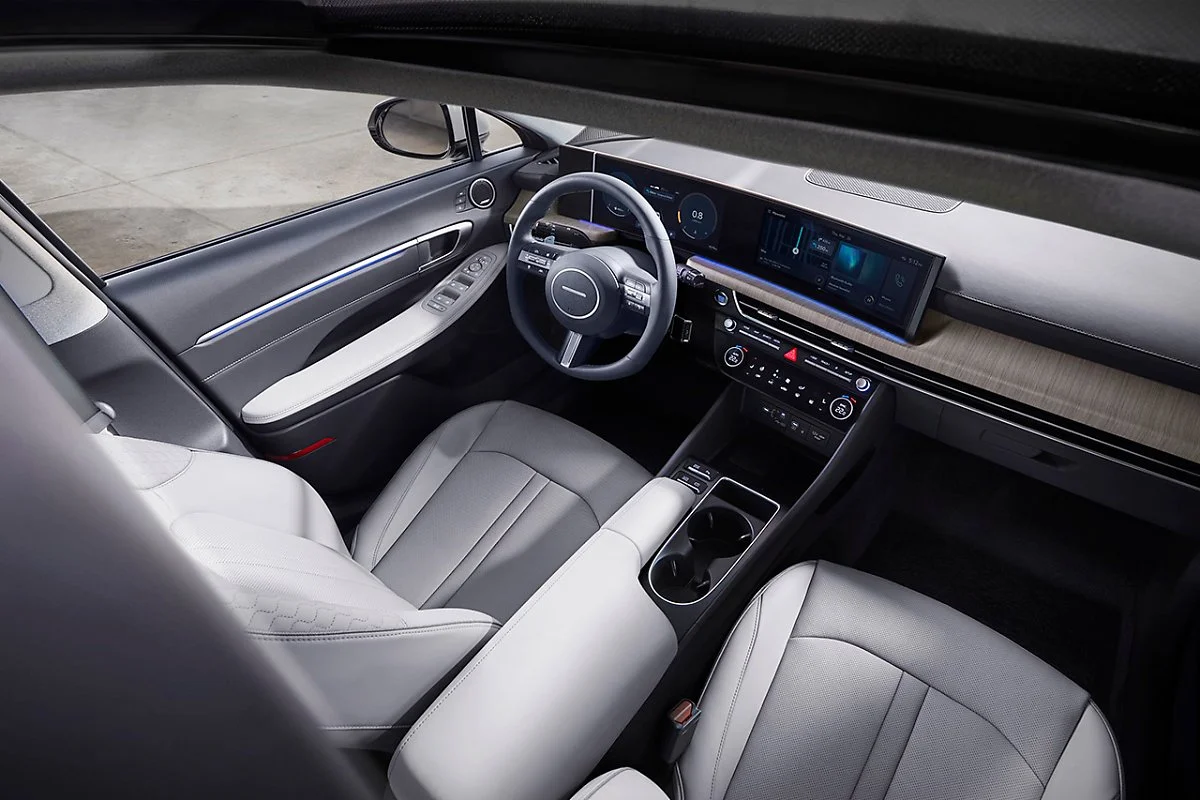 쏘나타 디 엣지 실내 디자인은 운전자 중심 구조를 계승하면서 섬세한 하이테크 디테일을 더해 프리미엄 세단의 감성을 구현했다. 특히 현대차 최초로 적용된 파노라믹 커브드 디스플레이는 운전석과 센터페시아까지 디지털 클러스터와 내비게이션 화면이 하나로 쭉 이어져 깔끔하고 세련된 인상을 남긴다.