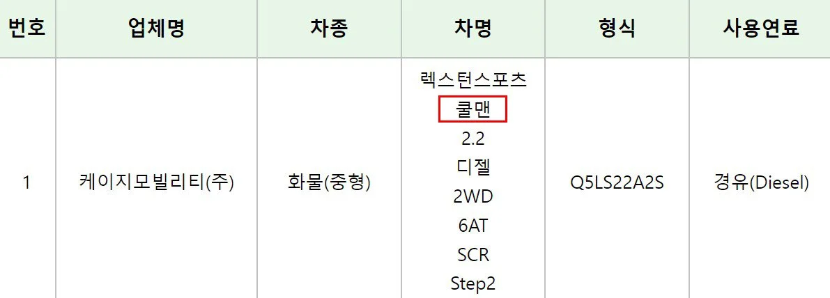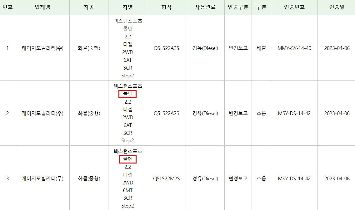 하지만 렉스턴 스포츠 페이스리프트 모델의 정확한 차명은 렉스턴 스포츠 쿨멘, 렉스턴 스포츠 쿨멘 칸이다. 쿨맨(Cool Man)이 아닌 쿨멘(Culmen)이다. 환경부 자료를 살펴보면 가장 2.2디젤 2WD 6AT 모델만 쿨맨으로 기입됐고, 나머지 모델은 모두 쿨멘으로 기입된 것을 확인할 수 있다. 즉 첫 번째 모델의 차명이 오타인 것이다.