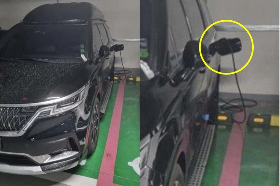 사진 속 카니발 차주는 마치 전기차 충전 중인 것처럼 주유구를 열고 충전기 콘센트까지 꽃아 놓는 기행을 펼쳤다. 전기차 충전 구역에 주차 후 신고 및 단속을 피하기 위한 것으로 보인다.