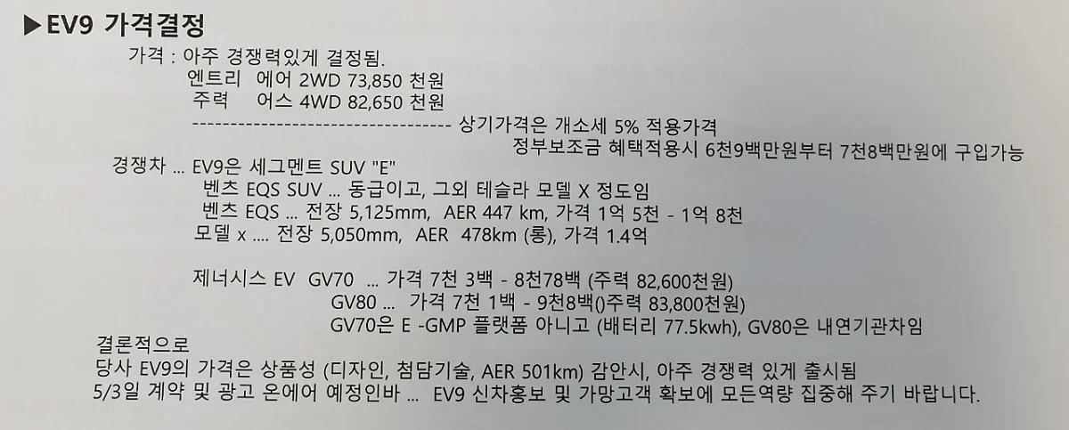 27일 기아 영업 일선에서 유출된 것으로 추정되는 기아 EV9 관련 문서 일부가 온라인을 통해 확산되고 있다. 해당 문건에는 EV9의 가격 정보 및 경쟁 모델, 계약 일정 정보가 포함되어 있어 EV9의 전반적인 정보를 확인할 수 있다.
