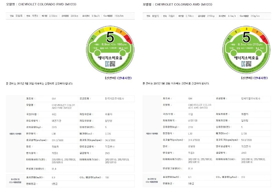 최근 한국에너지공단 연비인증 데이터를 통해 국내 출시 예정인 쉐보레 콜로라도의 사양과 연비 등 일부 제원이 확인됐다. 국내 시장에 출시하는 콜로라도는 후륜구동 모델과 AWD 모델 모두 출시하며, 2.7리터 가솔린 터보 엔진이 탑재된다.