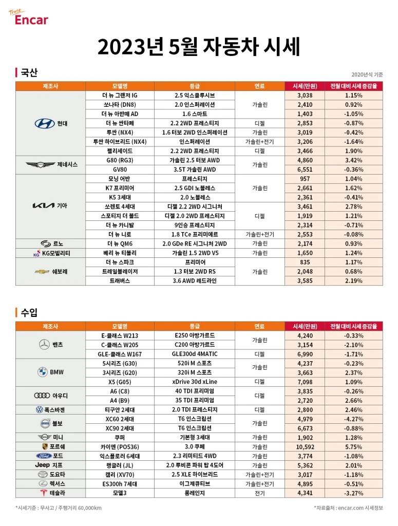엔카닷컴이 2023년 5월 중고차 시세를 공개했다. 이번에 공개된 중고차 시세는 엔카닷컴 빅데이터를 토대로 현대자동차, 기아, 르노코리아자동차, 쌍용자동차 등 국내 완성차 브랜드와 벤츠, BMW, 아우디 등 수입차 브랜드의 2020년식 인기 차종 중고차 시세를 분석한 결과다. 주행거리 기준은 60,000km이며 무사고 차량을 대상으로 분석했다.
