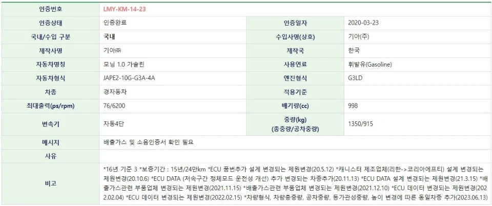 자동차 배출가스 및 소음 인증시스템 공공 데이터에 따르면 국내에 출시되는 신형 모닝은 1리터 가솔린 엔진 단일 파워트레인으로 운영된다. 현재 모닝 1.0 가솔린, 모닝 1.0 가솔린 밴 모델이 인증이 완료된 상태다.