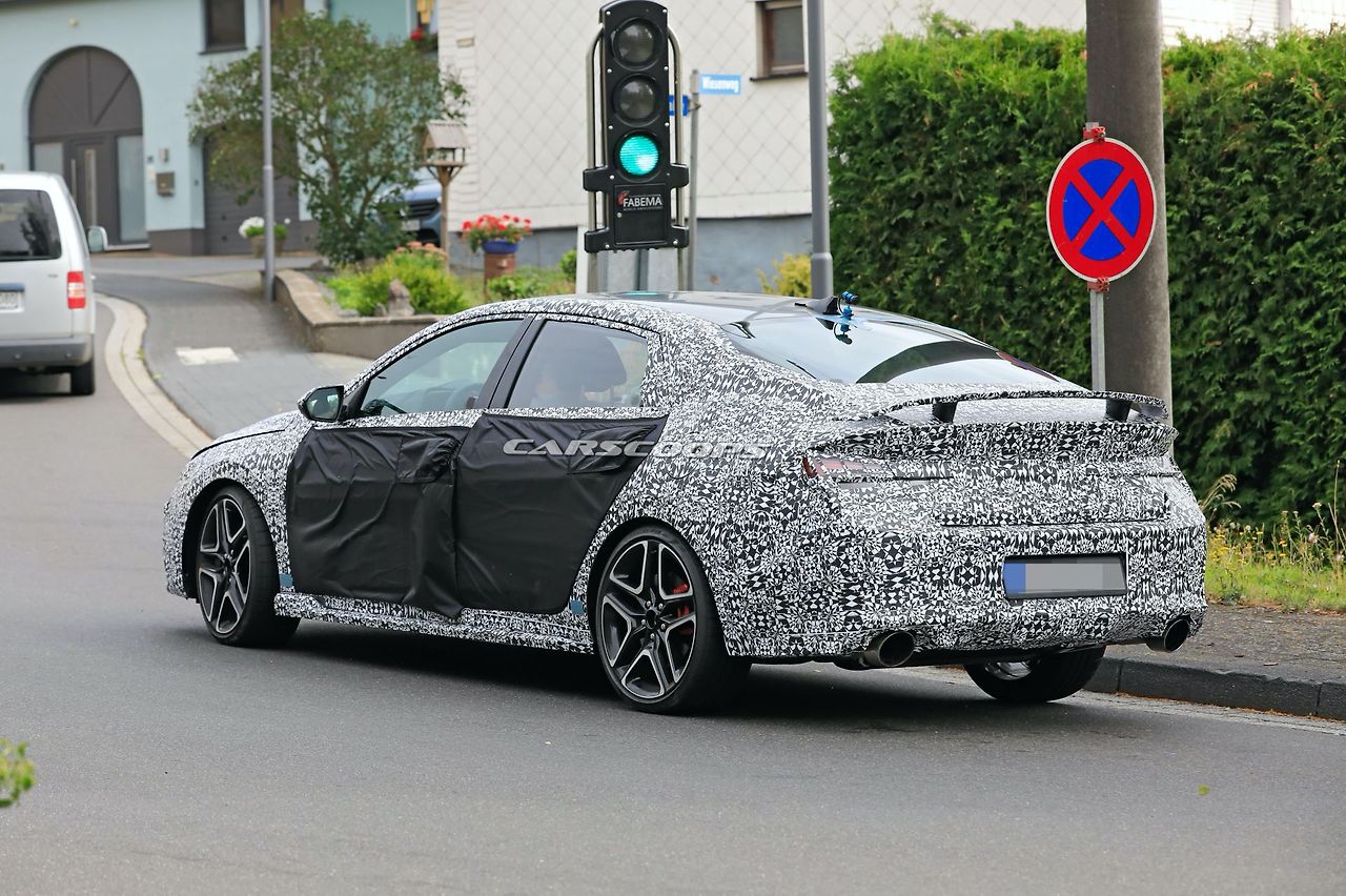 후면 디자인을 통해 이 모델이 아반떼 N 라인이 아닌 아반떼 N 임을 한눈에 확신할 수 있다. 기존의 현대 N 모델들은 해치백을 기반으로 한 만큼 루프 스포일러가 장착됐지만, 아반떼 N은 트렁크 리드 상단에 리어 스포일러를 장착해 스포티함을 강조했다. 또한 범퍼 하단 양 끝에는 존재감이 넘치는 대구경 듀얼 머플러를 적용해 고성능 모델임을 강조했다. 다만, 기존 N 브랜드 모델의 상징 중 하나인 삼각 보조 제동등이 보이지 않는데, 리어 글라스 상단 중앙부에 적용될 가능성이 높아 보인다.