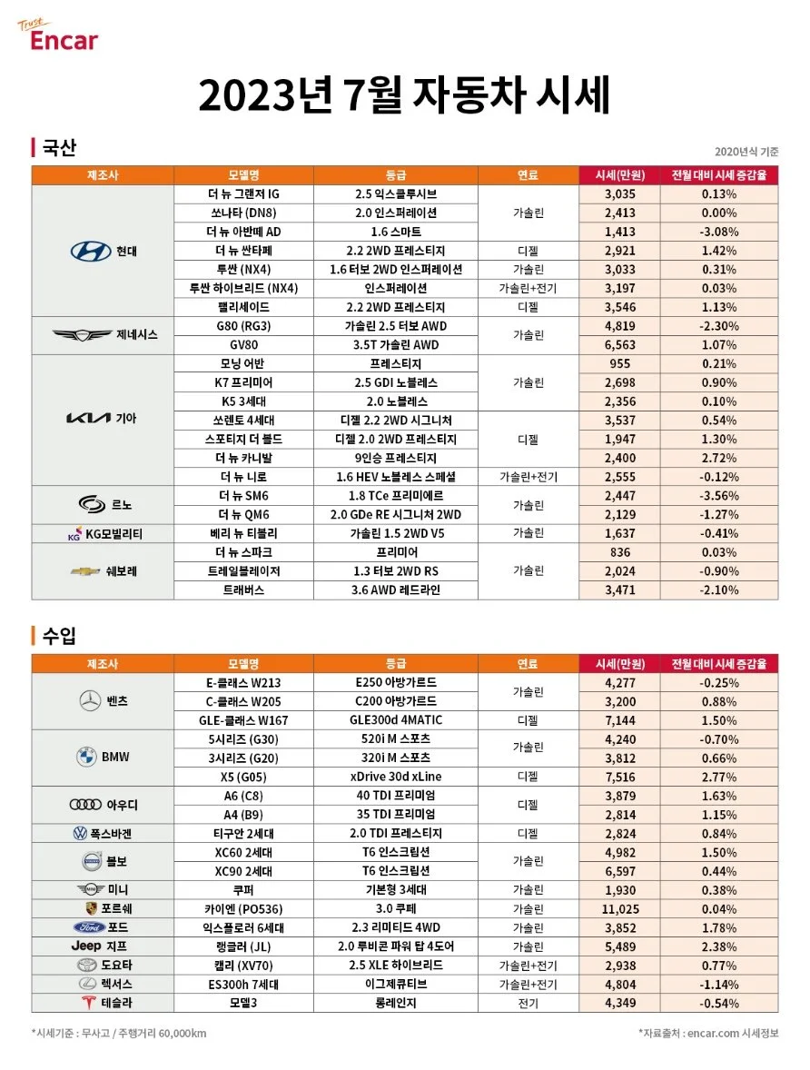 엔카닷컴이 2023년 7월 중고차 시세를 공개했다. 이번에 공개된 중고차 시세는 엔카닷컴 빅데이터를 토대로 국내 완성차 브랜드와 주요 수입차 브랜드의 2020년식 인기 차종 중고차 시세를 분석한 결과다. 주행거리 기준은 60,000km이며 무사고 차량을 대상으로 분석했다.